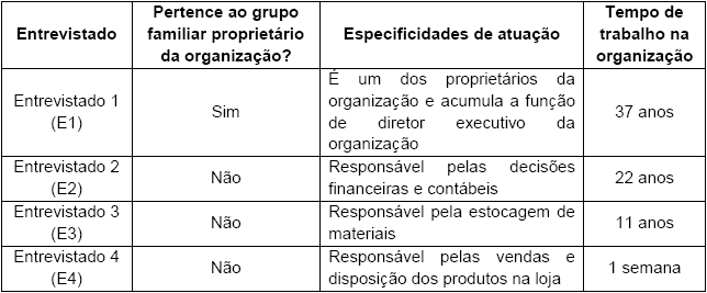 Caracterizaram-se como sujeitos desta pesquisa quatro trabalhadores de uma empresa familiar no ramo de cachaçaria que são apresentados na Figura 1. Essa escolha é considerada adequada uma vez que não foi preocupação desta pesquisa a seleção de uma quantidade representativa para compor o quadro de sujeitos investigados, assim como recomendam Godoi e Mattos (2006).