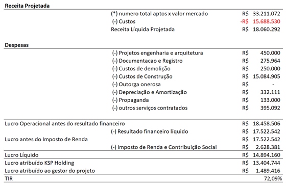 As análises realizadas apontaram a possibilidade de se obter resultados brutos com o empreendimento estimados em R$ 33,2 milhões, com um resultado líquido de R$ 14,8 milhões e a TIR (Taxa Interna de Retorno) do empreendimento projetada de 72,09%, demonstrados no Apêndice A. É oportuno mencionar que os dois imóveis estavam avaliados na época para a venda em R$ 2 milhões, o que mostrou desde logo ser mais vantajoso realizar o empreendimento do que vendê-los.