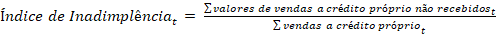 O indicador objetiva utilizar a inadimplência sobre a parcela de vendas a prazo determinada pela fórmula anterior, que são aquelas que realmente sofrem o risco de não pagamento. Outro ponto a se notar é que os tempos analisados devem ser semelhantes. Assim, a inadimplência deve ser relacionada ao não pagamento das vendas do mesmo período.