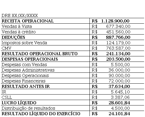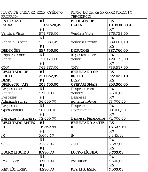 As vendas a prazo correspondem a 49% do total de vendas da empresa. Os impostos sobre venda foram arbitrados em 11% do valor total das vendas, assim como o proporcional calculado na empresa. O CMV foi também calculado de acordo com a média anual da empresa. Os cálculos dos impostos sobre a renda foram realizados considerando 15% de taxa e 9% da contribuição social.