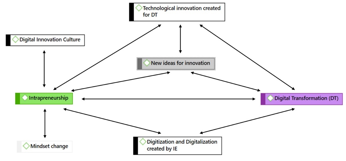 Figure 2 shows the relationship between intrapreneurship and digital transformation. Intrapreneurship is associated with the codes of the culture of digital innovation (132 citations) and mindset change (16), as well as associated with the codes of technological innovation created for DT (194), and with the digitization and digitalization created by IE (98). These last two codes are common to both constructs IE and DT. In the center of Figure 2 there is the code ‘new ideas for innovation’, which is an attribute of intrapreneurship, that is, the conception and implementation of the idea are linked to intrapreneurship, and can be associated with digital transformation, receiving its influence