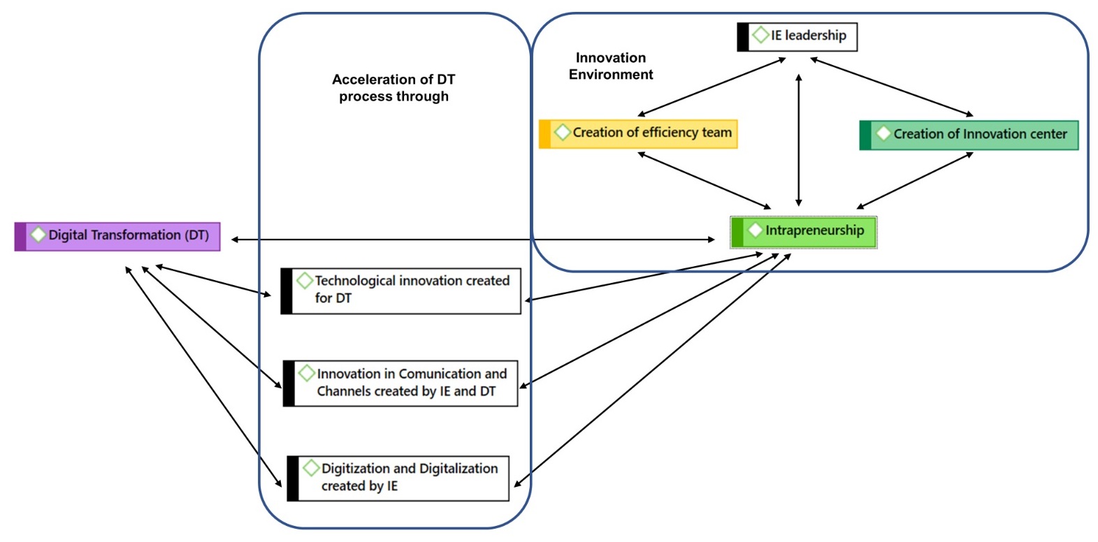 Figure 3, which derives from the IE x DT relationship, allows observing the formation of two quadrants, one related to the innovation environment fostered by intrapreneurship, and the other related to the acceleration of the digital transformation process through technological innovations.