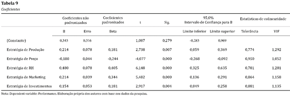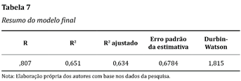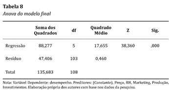A análise resultou em modelo estatisticamente significativo [F(8,99)=24,962; p<0,001; R²=0,669]. Porém, ao verificar o teste t para cada variável, observou-se que os resultados variaram para cada categoria. Algumas categorias apresentaram p-valor>0,05, não rejeitando a hipótese nula de que os componentes foram gerados ao acaso. Neste sentido, novo modelo excluindo tais variáveis foi processado, mantendo apenas aquelas relacionadas à produção, preço, rh, marketing e investimentos. Ao submetê-lo à regressão múltipla, ele apresentou maior R² ajustado de 0,634 e R de 0,807, indicando sua capacidade explicativa em 65,1% das variações no desempenho (Tabela 7).