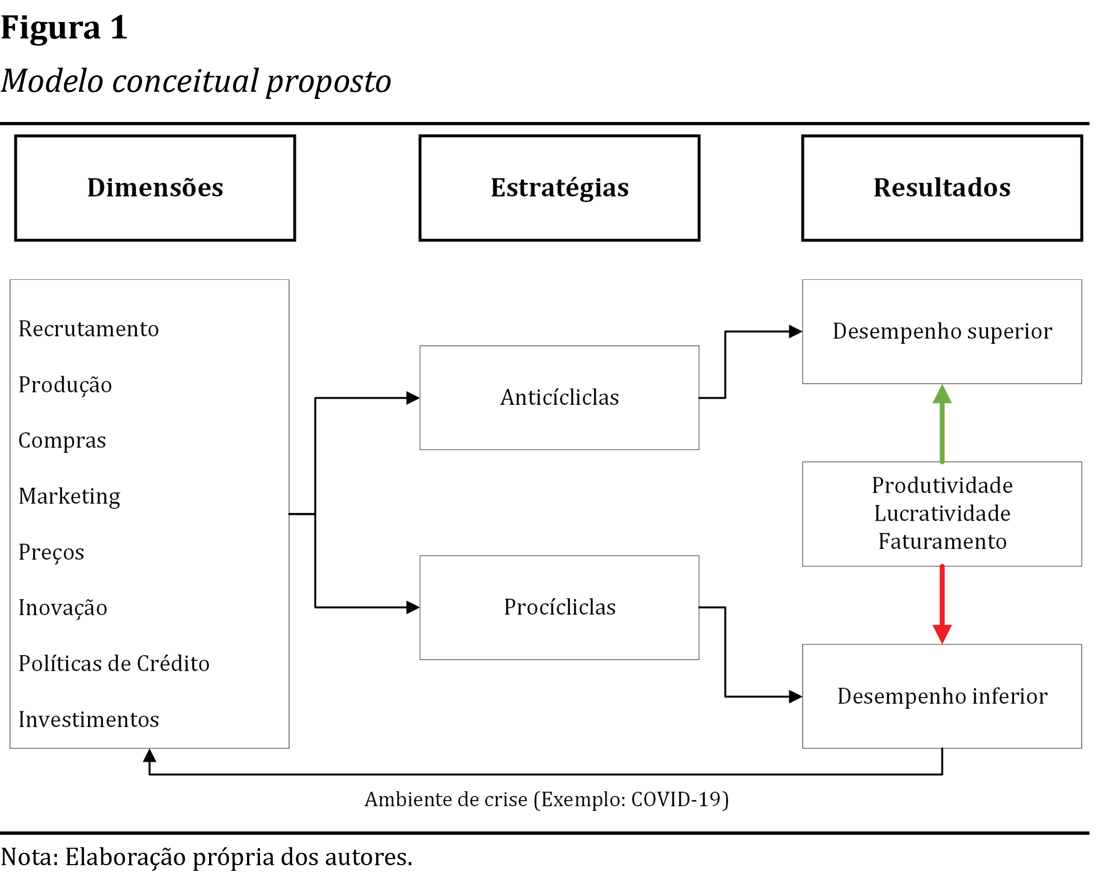 De modo geral, a literatura sustenta que estratégias anticíclicas relacionadas às dimensões aqui de interesse (Recrutamento, Produção, Compras, Marketing, Preços, Inovação, Crédito, Investimento) associam-se a desempenho superior. Segundo Lopes e Carvalho (2021), “resultados no desempenho organizacional estão associados à evolução técnica, à inovação e à qualidade dos fatores humanos, estruturais e relacionais”. Para efeitos deste trabalho, o desempenho de micro e pequenas empresas será considerado a partir da sua produtividade, lucratividade e faturamento (Sá & Amorim, 2018). De maneira análoga, assume-se que procíclicas estariam associadas a desempenho inferior. Este é o modelo conceitual deste estudo. A Figura 1 ilustra o modelo proposto.