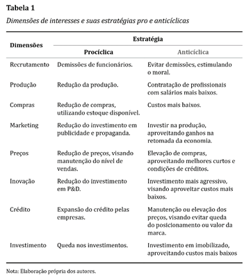 Estratégias procíclicas seguem a tendência de mercado (Casillas et al., 2019; Mann & Byun, 2017; Rico et al., 2021). Em meio a crises, dado à redução da demanda, aumento da competição e elevação das incertezas, as empresas usualmente adotam tais estratégias. Elas visam a sobrevivência de mercado e envolvem iniciativas tais como cortar custos (Bromiley et al., 2008; Casillas et al., 2019; Rico et al., 2021) e investimentos (Conti et al., 2015). Por sua vez, estratégias anticíclicas envolvem, mesmo em contextos de crise, a busca por oportunidades de maneira mais ofensiva. Latham e Braun (2011) têm enfatizado relação positiva entre estratégias anticíclicas e desempenho. Tais estratégias incluem a manutenção ou o incremento de investimentos, do quadro de pessoal, entre outros (Bromiley et al., 2008; Conti et al., 2015). A literatura, que associa ambas as estratégias, usualmente limita as categorias de análise ao marketing, P&D ou despesas de capital (Navarro et al., 2010). De maneira inovadora, este artigo amplia as categorias a oito dimensões: i) recrutamento; ii) produção; iii) compras; iv) marketing; v) preços; vi) inovação; vii) política de crédito; viii) investimentos.
