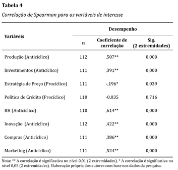 As estratégias de produção (β=0,181; t=2,738; p<0,05); recrutamento (β=0,405; t=6,148; p<0,05); marketing (β=0,344; t=5,482; p<0,05); preços (β=-0,244; t=-4,077; p<0,05) e investimento (β=0,181; t=2,917; p<0,05) são previsoras de desempenho. A equação do modelo é dada por y=0,343 + 0,214(Produção)-0,180(Preço) + 0,480(RH) + 0,214(Marketing) + 0,154(Investimento). Desta forma, apesar de constatada correlação positiva entre estratégias anticíclicas e desempenho, e negativa entre procíclicas e desempenho (Tabela 4), ao nível de significância estatística de 0,05, somente as variáveis de produção (anticíclicas), RH (anticíclicas), marketing (anticíclicas), preços (procíclicas) e investimento (anticíclicas) são preditoras do desempenho, sendo que as estratégias de preços procíclicas interferem negativamente nele.