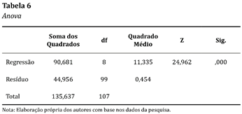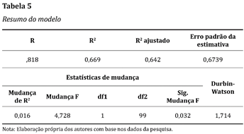 Os autores também verificaram estatísticas de colinearidade (Tabela 9). Buscou-se observar se os valores de tolerância para cada categoria foram superiores a 0,1, e os de VIF inferiores a 9, caracterizando ausência de multicolinearidade. Em relação aos resíduos, verificou-se existência de outliers.