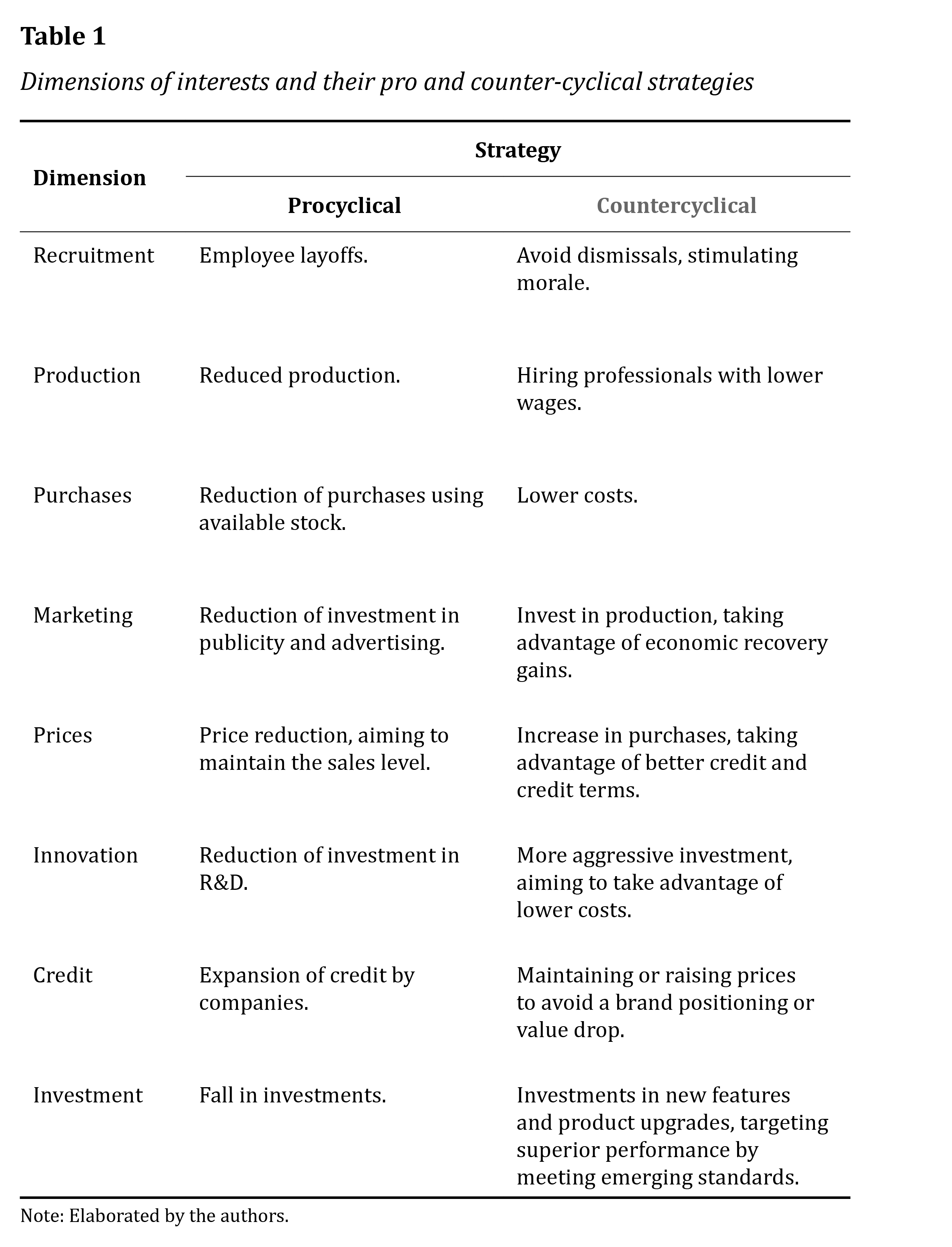 The last dimension is that of investments, restricted in recessive periods. Latham and Braun (2011) emphasize how companies sell assets to stabilize their finances in such scenarios (procyclical). If, on the one hand, this pattern can lead to overinvestments with consequent excess production capacity during the recovery, it can, in turn, imply the need for exaggerated cuts during recessions (Apaydin, 2011). On the other hand, companies that take advantage of lower prices during recessions to invest in fixed assets, for example, can guarantee adequate capacity and modern equipment. Such a strategy helps organizations offer superior products and gain market share in the recession and its subsequent recovery (Bromiley et al., 2008). Table 1 presents a summary of the dimensions of interest and the pro and anti-cyclical initiatives: