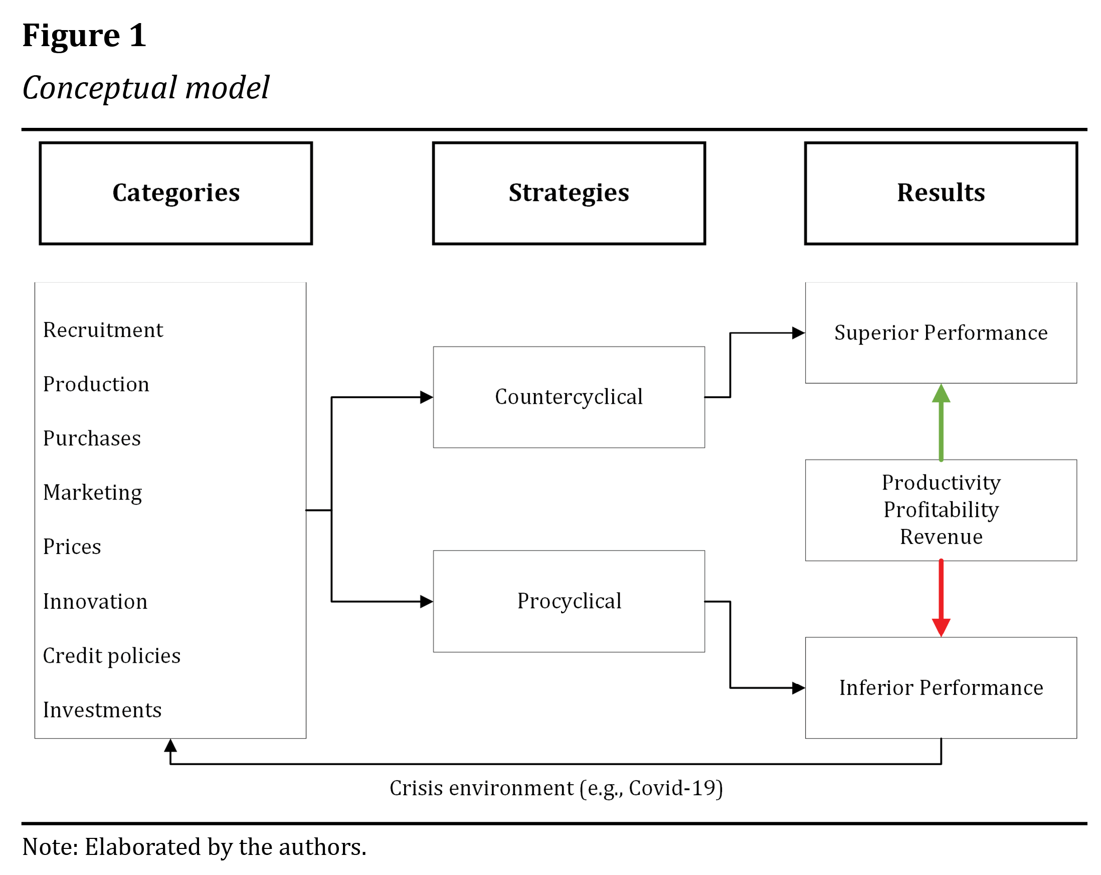 The literature generally supports that countercyclical strategies related to the dimensions of interest here (Recruitment, Production, Purchases, Marketing, Prices, Innovation, Credit, and Investment) are associated with superior performance. According to Lopes and Carvalho (2021), “results regarding organizational performance are associated with technical evolution, innovation and the quality of human, structural and relational factors”. For this work, the performance of micro and small-sized companies will be considered based on their productivity, profitability, and billing (Sá & Amorim, 2018). Analogously, it is assumed that procyclical would be associated with lower performanc. Figure 1 illustrates the conceptual model of this study.