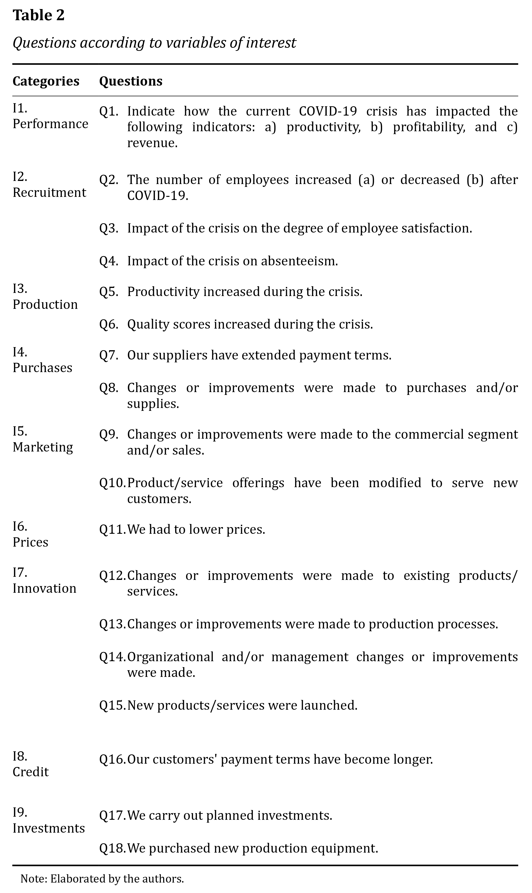 The research allowed the elaboration of a collection instrument with 20 structured questions derived from the conceptual model. Two blocks were part of the questionnaire. In the first, the questions were related to the characteristics of the companies. In the second, the questions aimed at information on how the Covid-19 crisis impacted companies, according to the eight thematic dimensions of interest. The statements were based on the literature on crisis management and coping strategies for content validation. Following Perrien et al. (1984), the researchers initially used a representative number of closed-question options to cover the answers. In addition, questions strictly related to the research topic were applied. The implications of the questions were considered in the tabulation and data analysis procedures.