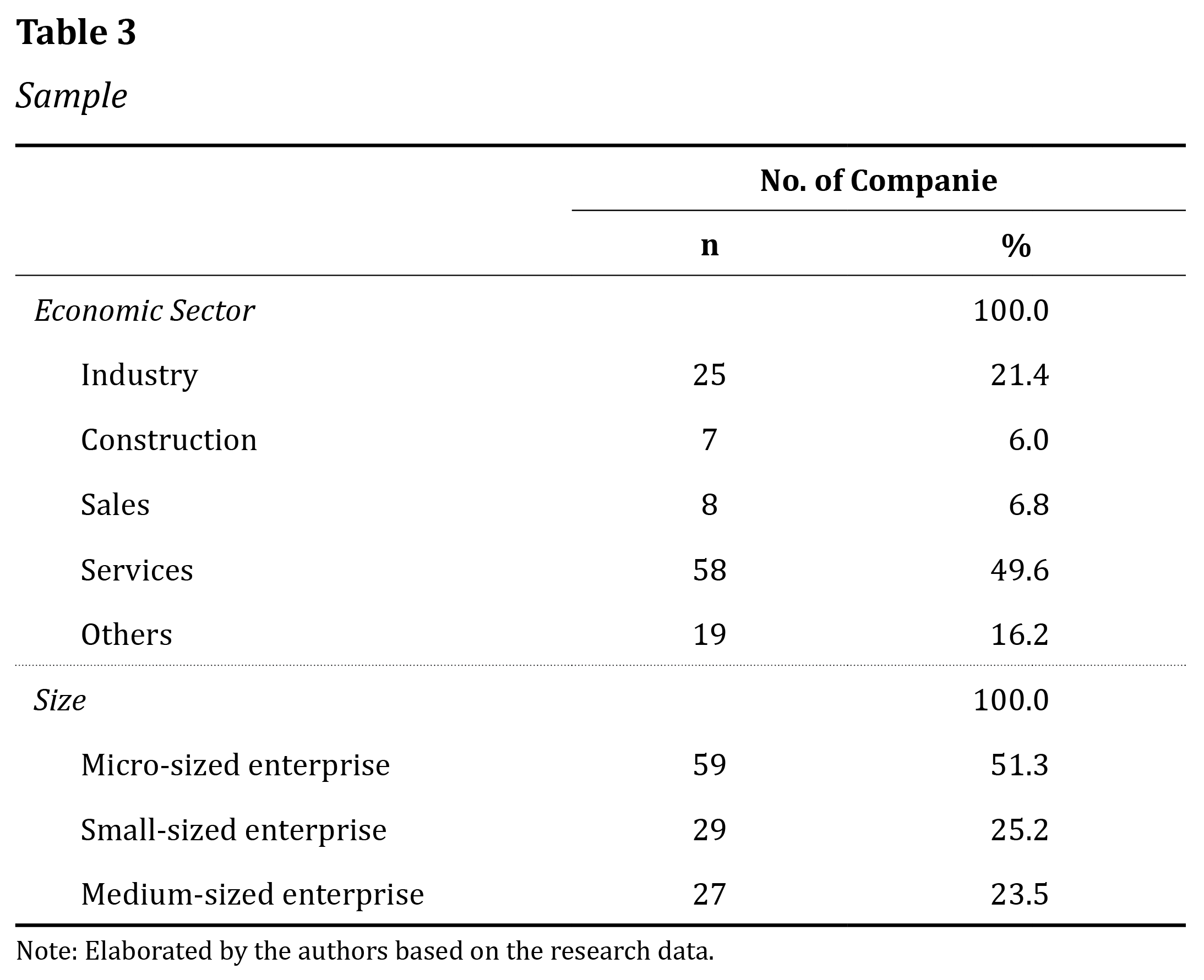 The research universe involves micro, small, and medium-sized enterprises (MSMEs) in Minas Gerais, Brazil. The population of MSMEs in Minas Gerais is 1,914,064, of which 1,775,694 are micro-enterprises, 63,610 are small-sized companies, and 74,760 are medium-sized companies (Sebrae, 2020). The sample was stratified by size within each stratum; the selection was made by simple random sampling, calculated considering a 90% confidence interval, with an error margin of 8%, resulting in a total of 118 companies (Cochran, 1977).