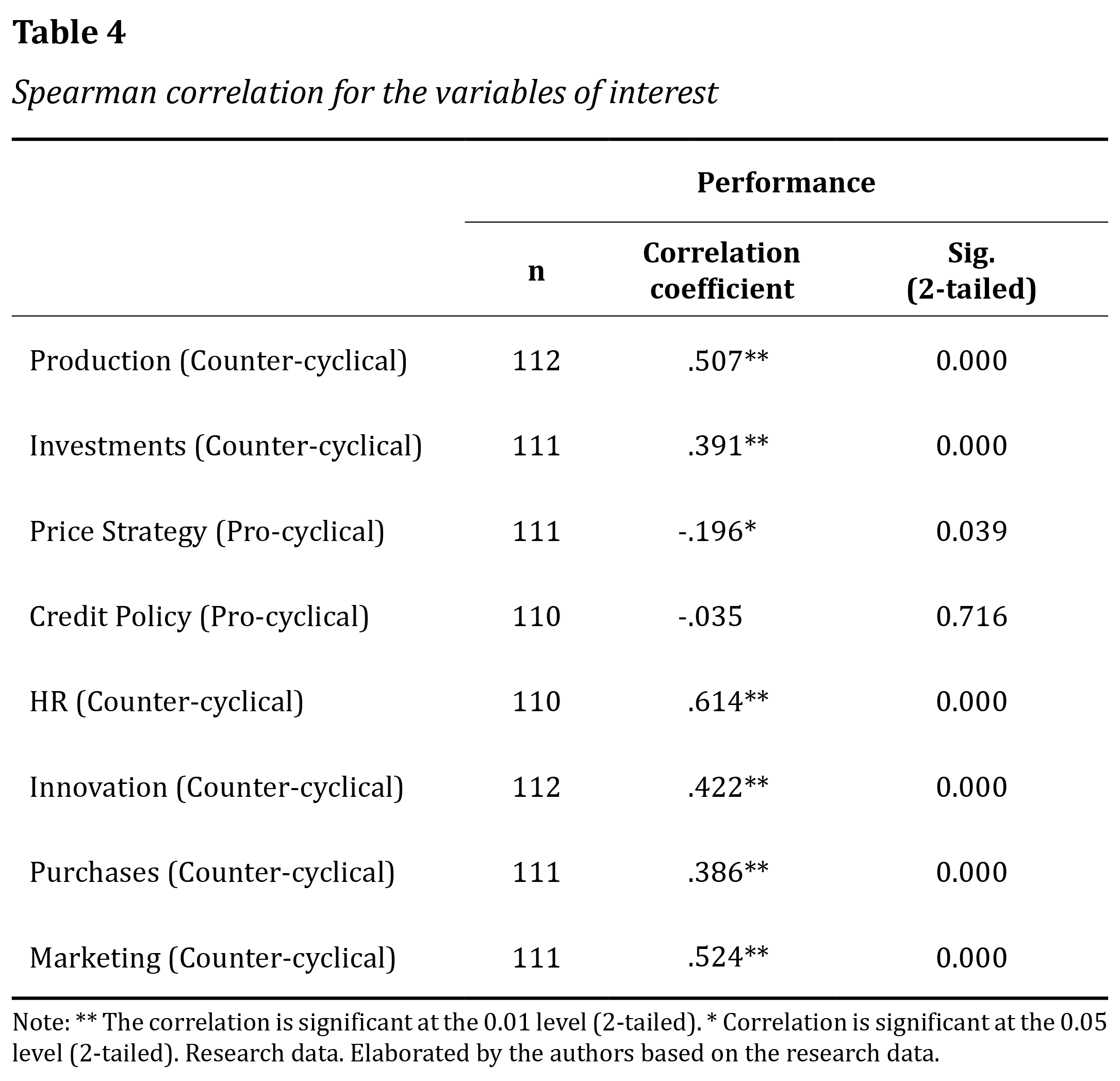 The correlation between procyclical pricing strategy and performance was negative (-.0196, at a significance level of 0.05). Although the intention to lower prices seeks to increase sales (Ang et al., 2000), such a strategy is associated with lower performance. Data suggest the possibility of depreciation of the company's positioning in the long term (Latham & Braun, 2011). In other words, the lesser the use of the price reduction strategy (procyclical), the greater the performance will tend to be (β=-0.244; t=-4.077; p<0.05). As for innovation, the countercyclical strategy presents a positive correlation (0.422, significance level of 0.01). However, the t-test showed a p-value greater than 0.05, denoting a non-prediction of performance. Concerning credit policy, the procyclical strategy of extending customers' payment conditions (Ang et al., 2000), common in times of crisis, showed a negative correlation (-0.035). The t-test also showed no prediction (p>0.05). This result indicates that extending payment terms (procyclical strategy) does not present significant differences in performance. Finally, the countercyclical investment strategy (Bromiley et al., 2008) showed a positive correlation (0.391, significance level of 0.01), indicating that the more significant its use, the greater the performance (β=0.181; t=2.917; p<0.05).