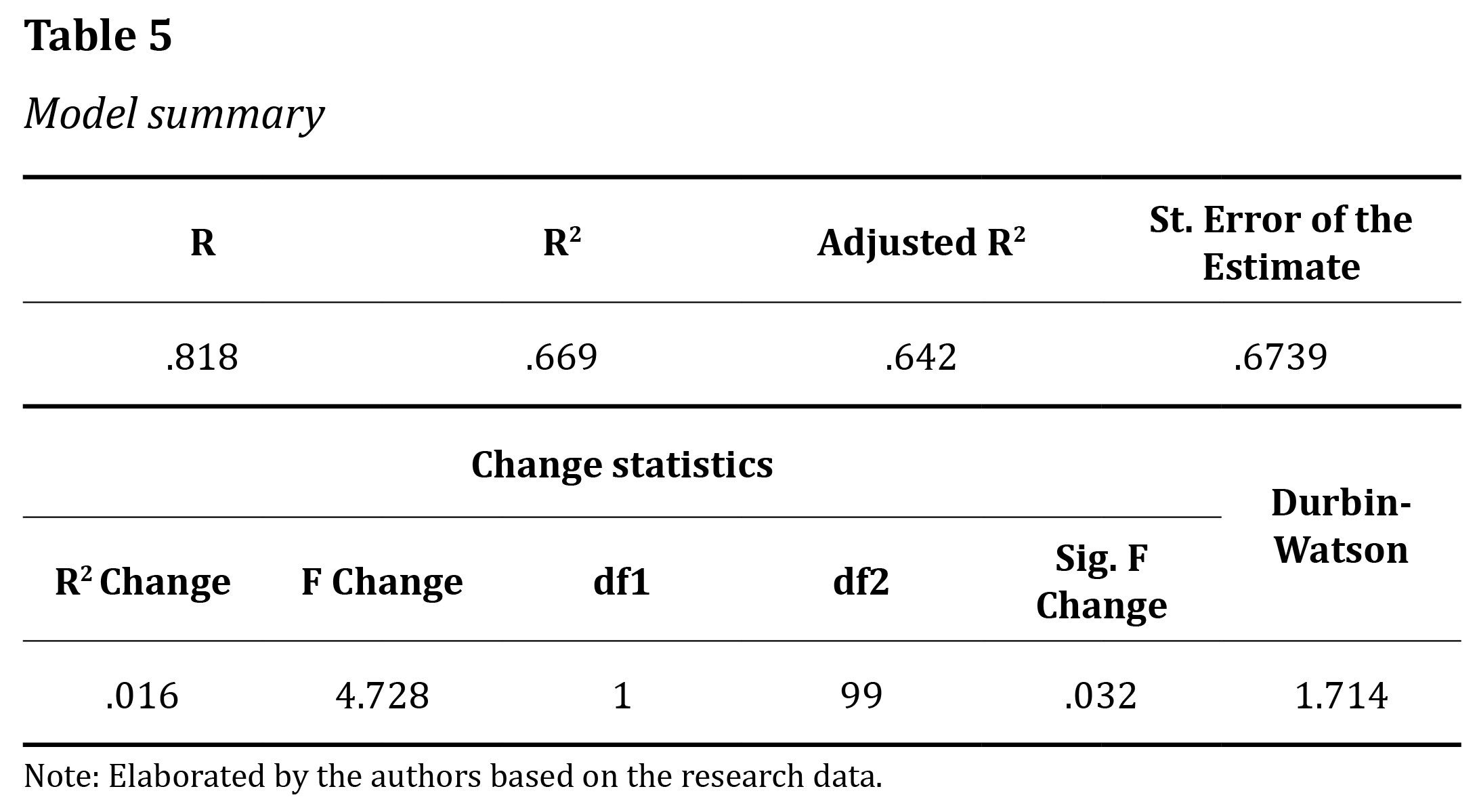 There is a positive correlation between performance and dimensions of countercyclical strategies and a negative correlation between performance and procyclical ones. The categories with the highest correlation (closer to 1) are countercyclical human resources, marketing, and production. The countercyclical strategy of maintaining prices was positive, along with the credit policy. For the correlation analysis, the classification proposed by Cohen (2013), was adopted, in which values below 0.30 are considered small; between 0.30 and 0.49, moderate; and equal to 0.50, large. The method of multiple linear regression was used to verify whether the categorical variables predict oscillations in performance, obtaining a mathematical model of this relationship. The model's output variable (dependent) was performance, and the predictor variables (independent) were recruitment, production, purchases, marketing, prices, credit policies, and investments. Table 5 presents the forward method, in which each variable was inserted in turn. The model with all variables had a higher adjusted R² of 0.642 and R of 0.818, indicating its ability to explain 64% of variations in performance; the better, the closer the R is to 1.