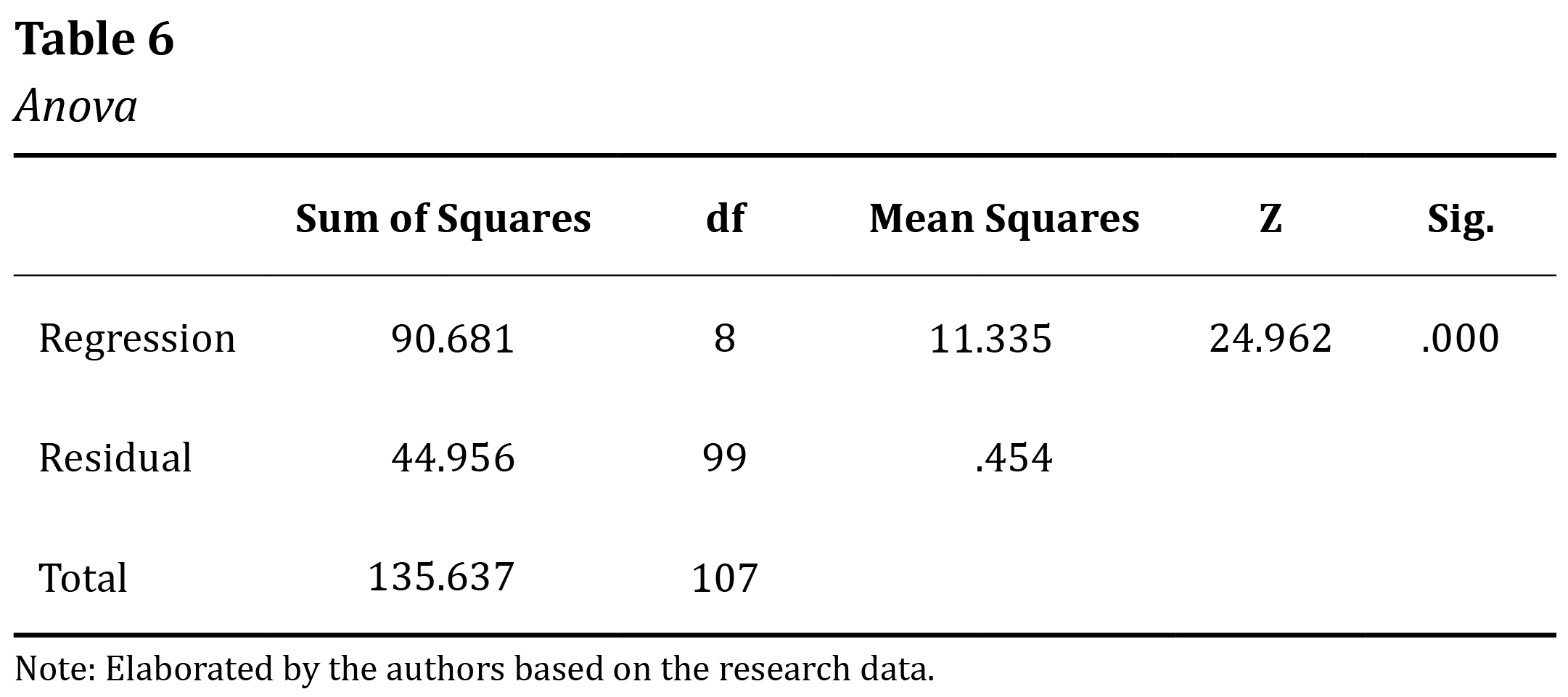 When submitting the model to the ANOVA test, the p-value<0.05 indicates validity as a predictor (Table 8).