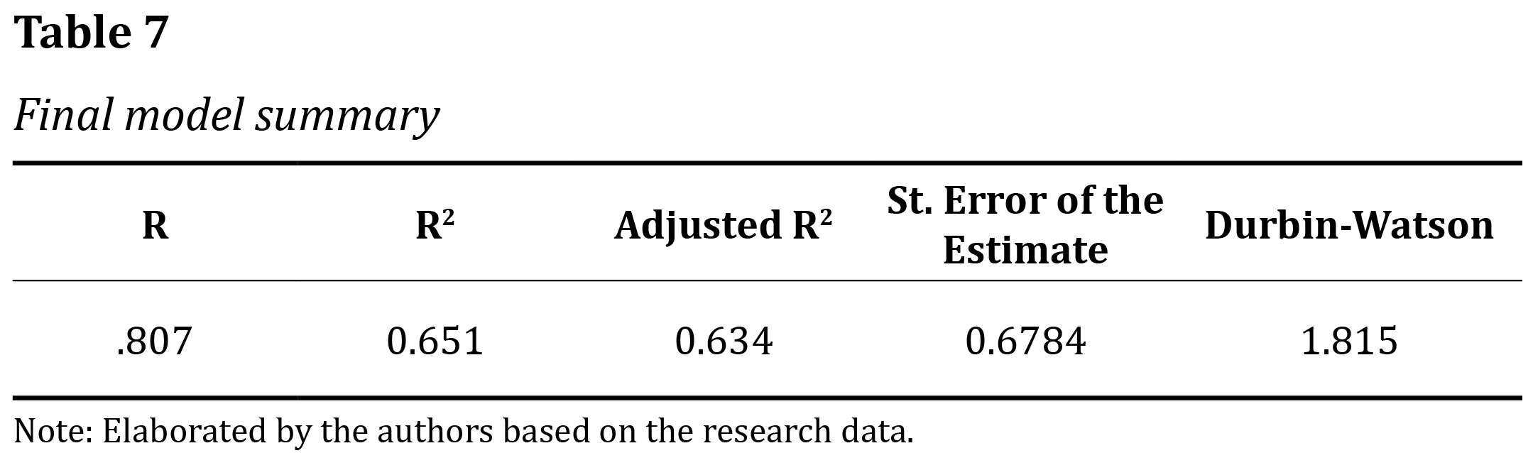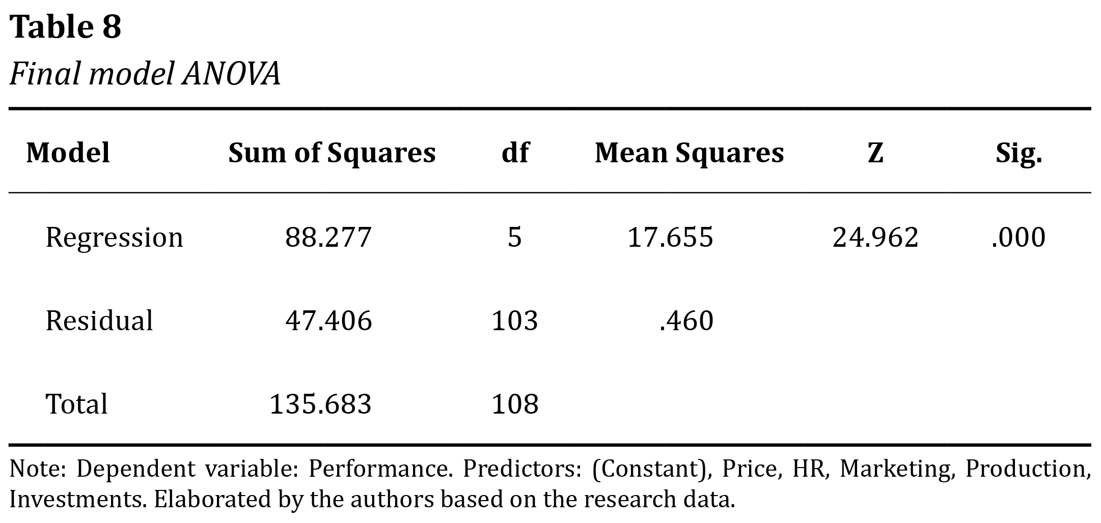 The analysis resulted in a statistically significant model [F(8.99)=24.962; p<0.001; R²=0.669]. However, when checking the t-test for each variable, it was observed that the results varied for each category. Some categories presented p-value>0.05, not rejecting the null hypothesis that the components were randomly generated. In this sense, a new model excluding such variables was processed, keeping only those related to production, price, HR, marketing, and investments. When subjected to multiple regression, we found a higher adjusted R² of 0.634 and R of 0.807, explaining about 65.1% of the variance in performance (Table 7).