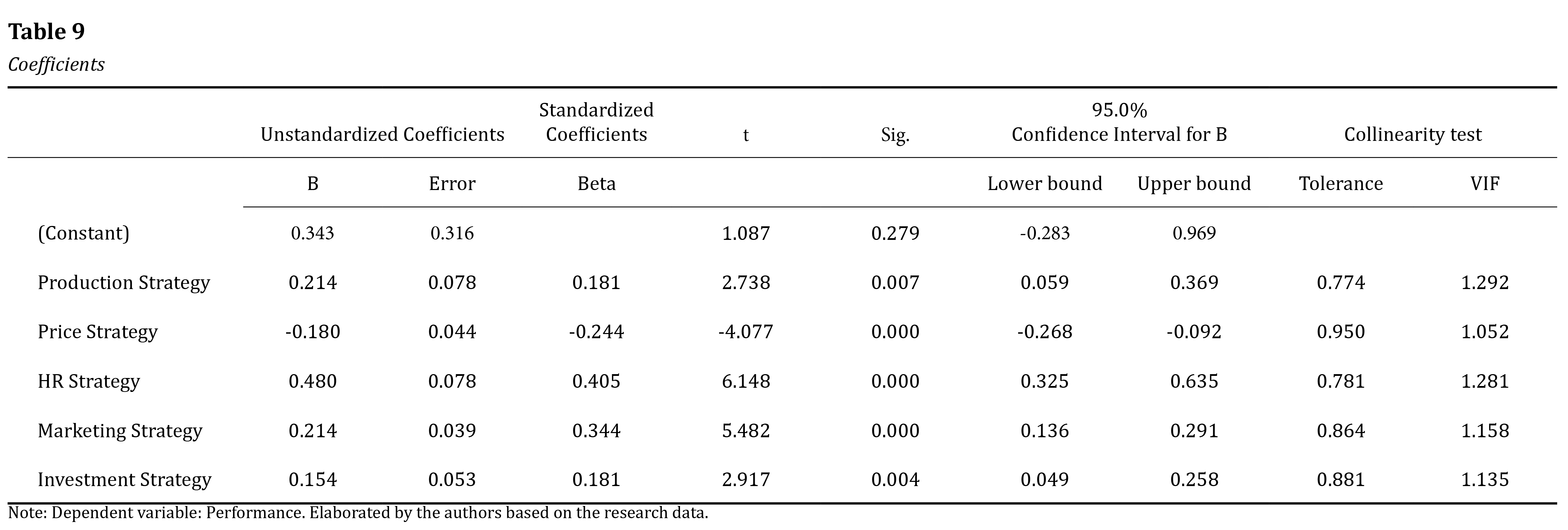 The production strategies (β=0.181; t=2.738; p<0.05); recruitment (β=0.405; t=6.148; p<0.05); marketing (β=0.344; t=5.482; p<0.05); prices (β=-0.244; t=-4.077; p<0.05), and investment (β=0.181; t=2.917; p<0.05) are performance predictors. The model equation is given by y=0.343 + 0.214(Production) -0.180(Price) + 0.480(RH) + 0.214(Marketing) + 0.154(Investment). Thus, despite the positive correlation between countercyclical strategies and performance and a negative one between procyclical strategies and performance (Table 4), at a statistical significance level of 0.05, only the production variable (countercyclical), HR (countercyclical), marketing (countercyclical), prices (procyclical), and investment (countercyclical) are performance predictors and procyclical pricing strategies negatively interfere with it.