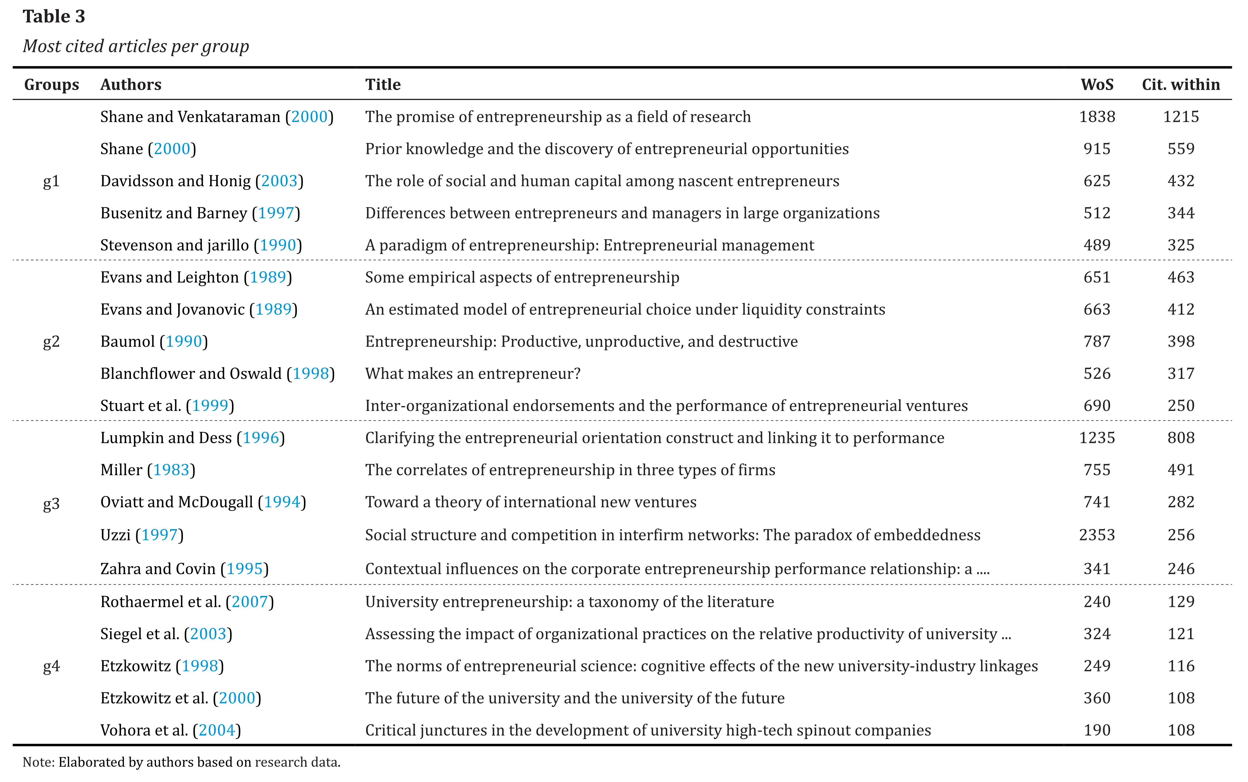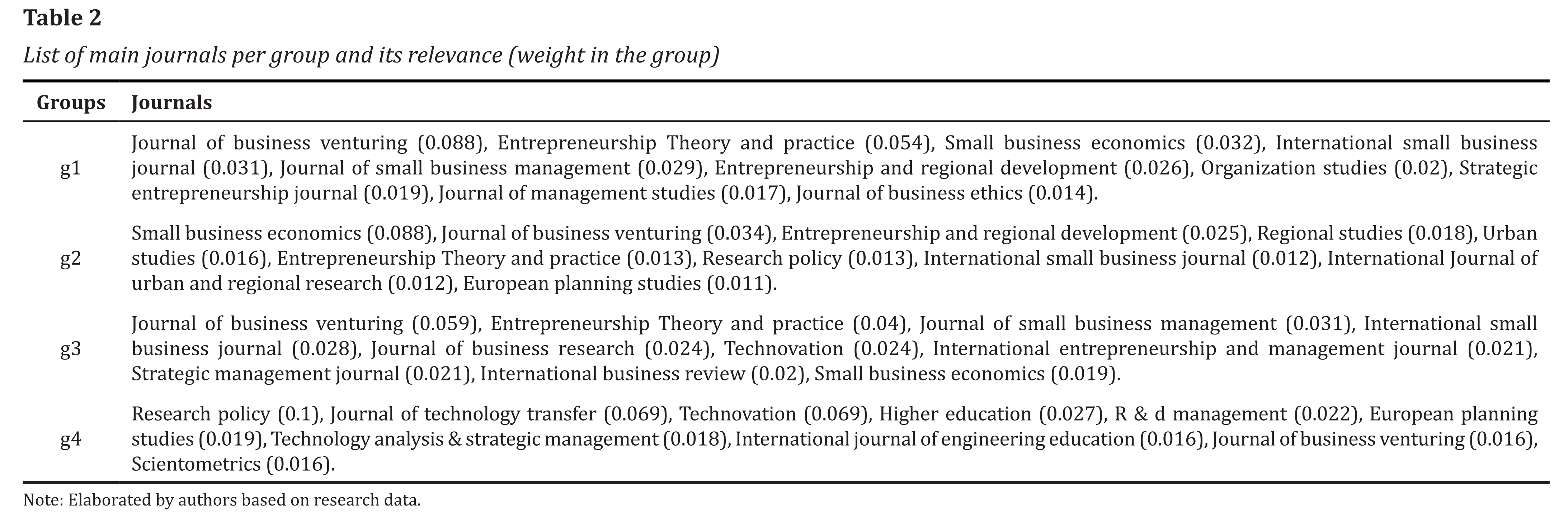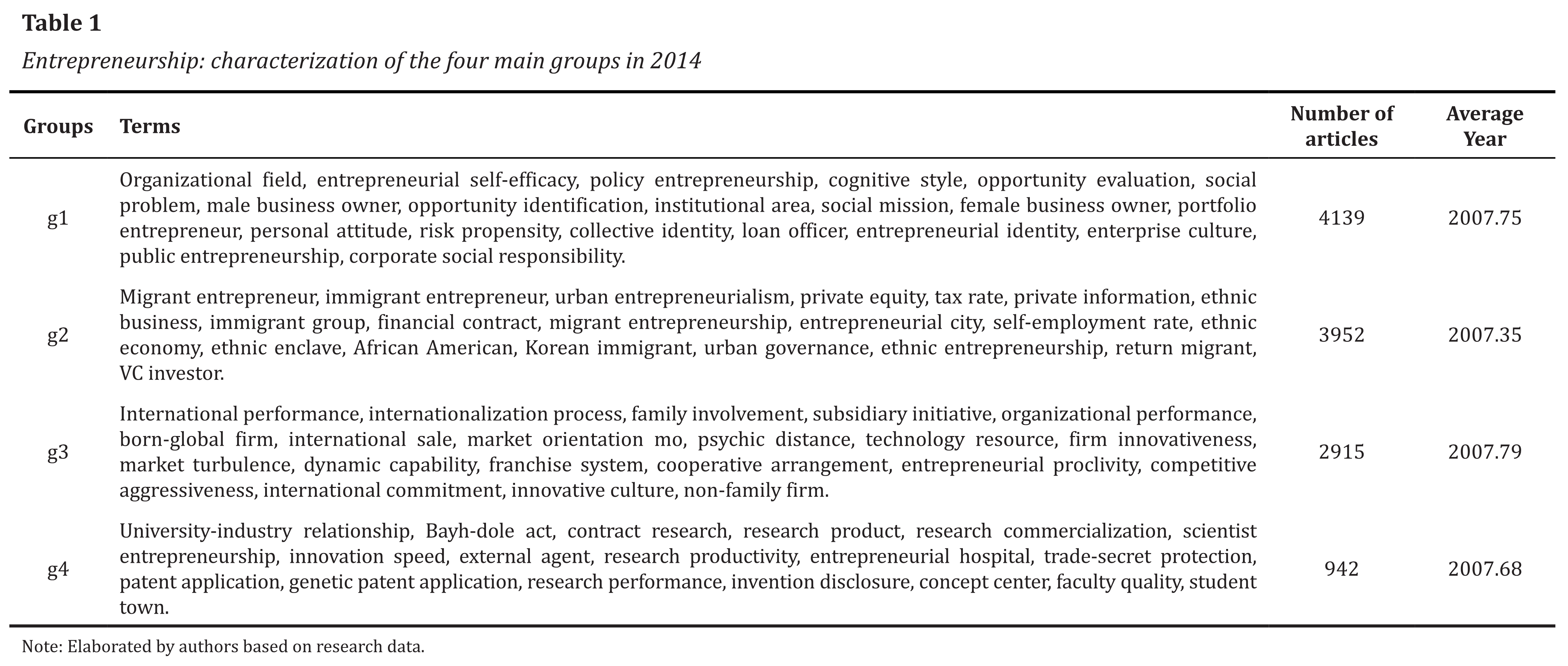 The articles from the g1 are related to the theoretical and conceptual perspectives on entrepreneurship. In the g2, the studies are related to the subject of migrant and ethnic entrepreneurship, and empirical approaches. The g3 group contains works about family firms, global firms, and corporative entrepreneurship. Finally, the g4 group includes texts about the corporate university.