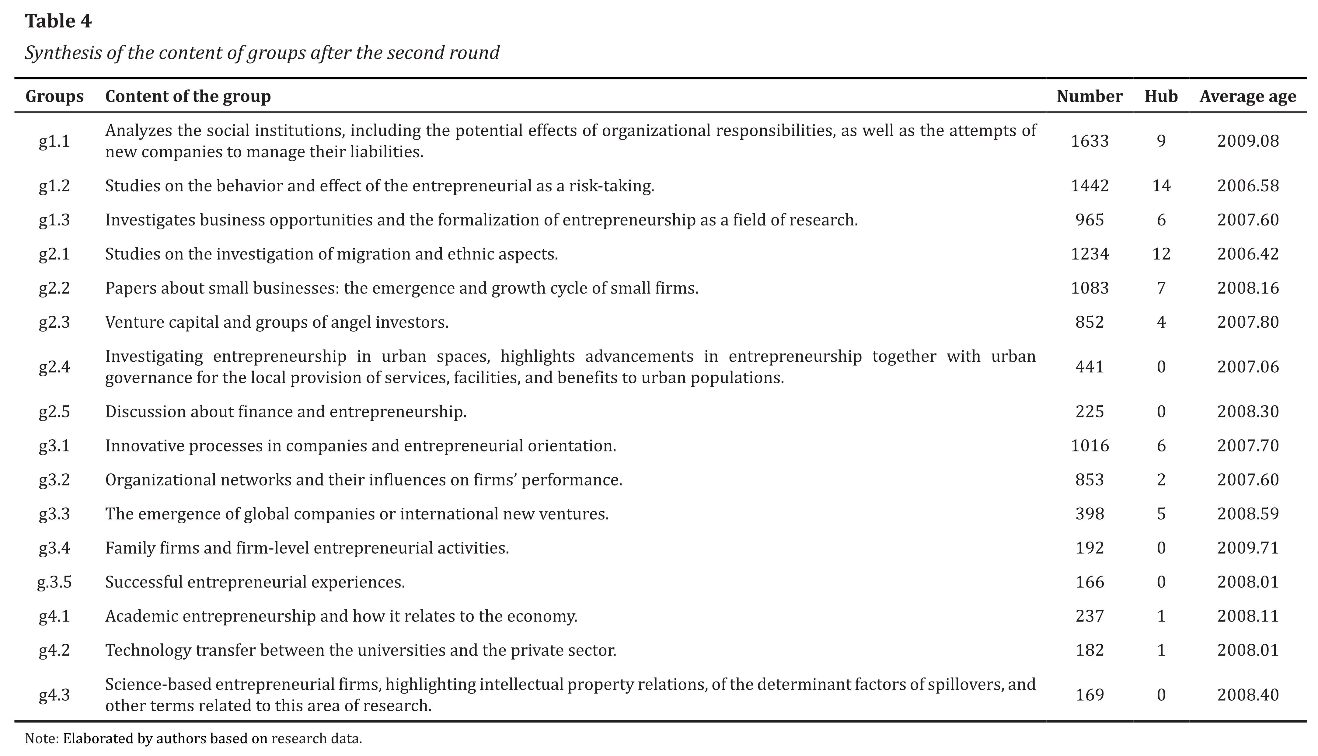 The first round of applying the methodology has generated useful insights into the progressive organization of entrepreneurship as an academic research field. The methodological procedures applied to the groups g1, g2, g3, and g4 detected 16 subgroups.