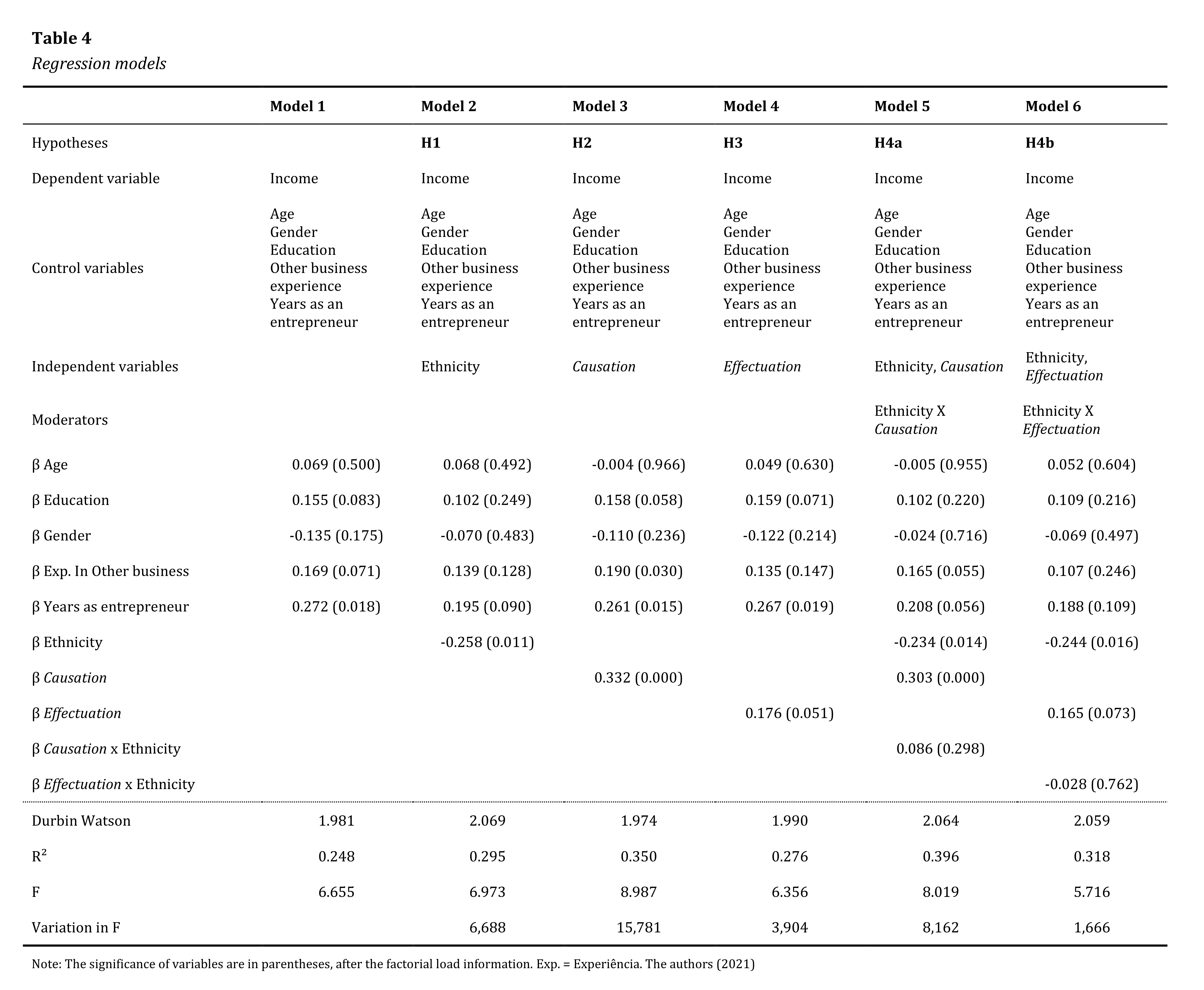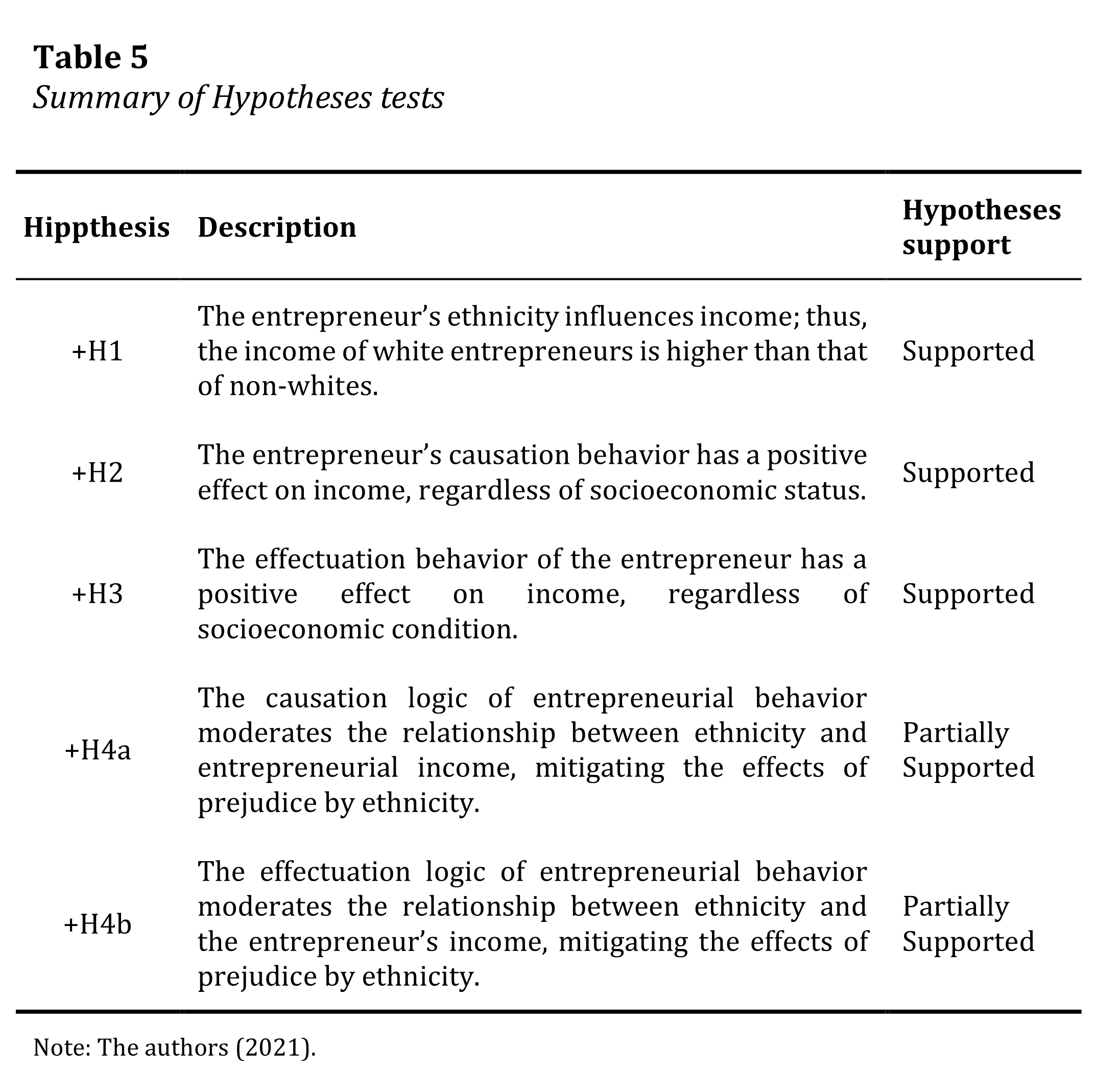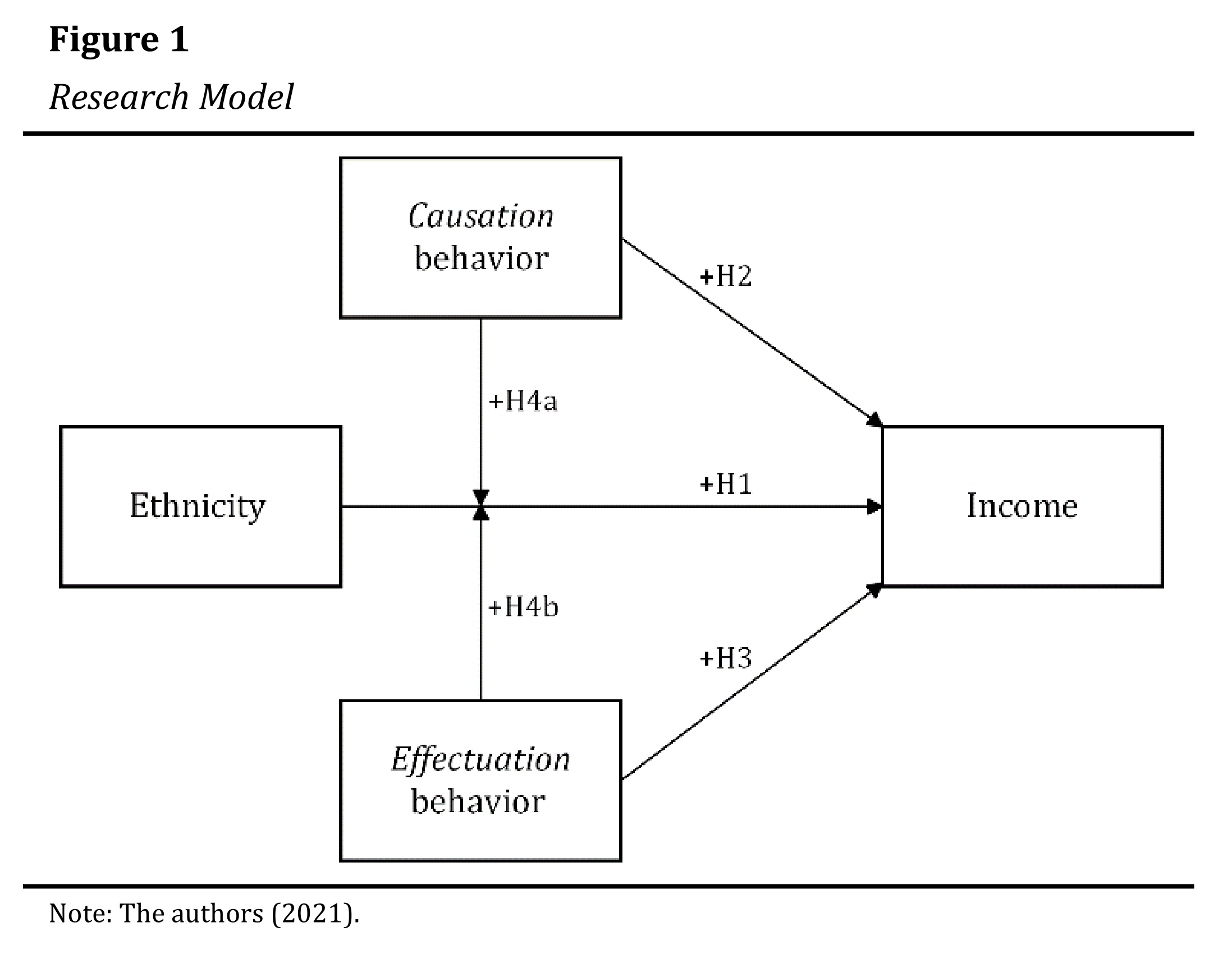In short, first, it is proposed that: (H1) there is a relationship between the individual’s ethnicity and their income as an entrepreneur; (H2) entrepreneurs, whose behavior is aligned with planning (causation), tend to have a positive effect on their income; (H3) the use, by entrepreneurs, of effectuation characteristics, such as flexibility, experimentation, loss tolerance, and the building of relationships, capable of establishing pre- agreements, also promotes positive effects on their income; (H4a and H4b) these behaviors (causation and effectuation) can mitigate the impact of ethnic prejudice on income.