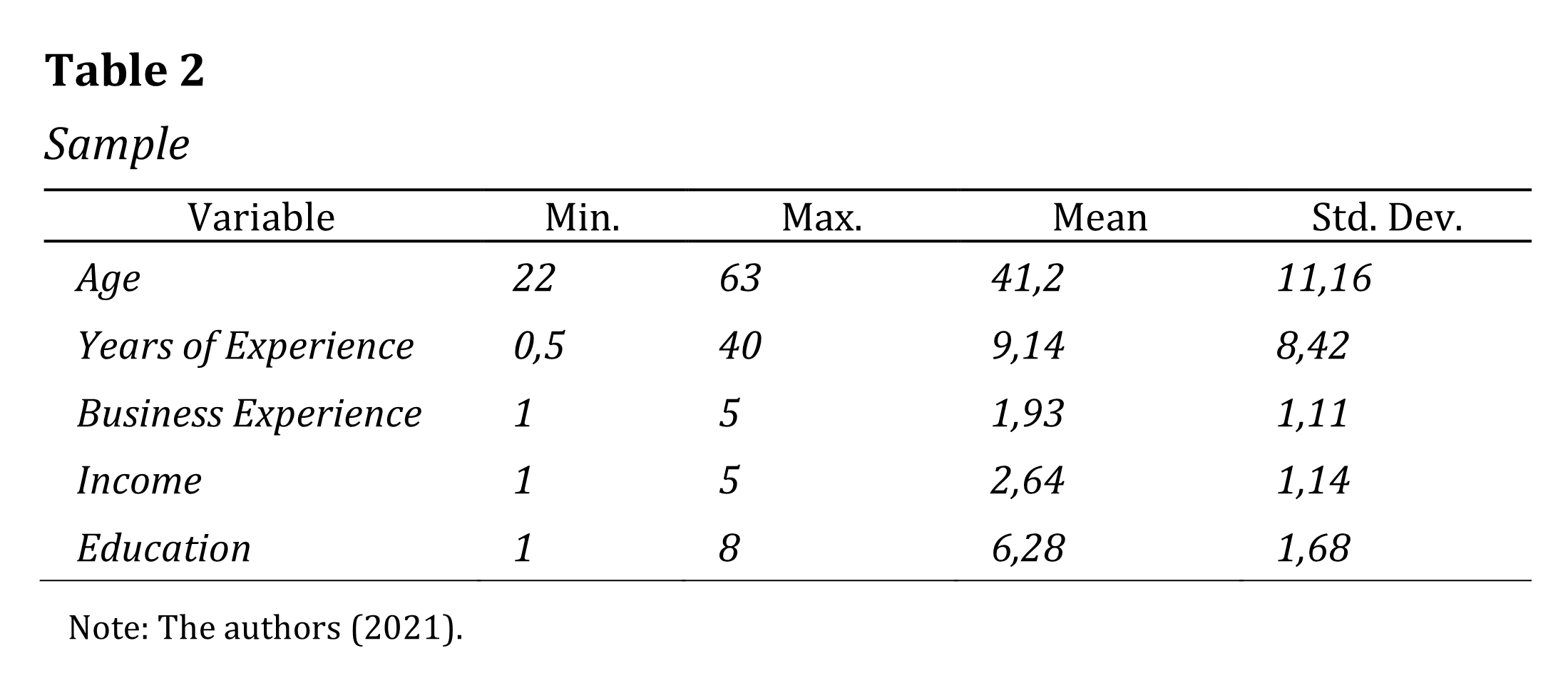 As for control variables, specific questions were included, in which respondents should identify, according to IBGE criteria, ethnicity, gender, age, level of education. Respondents should also answer about their previous experiences as entrepreneurs and how long they have been undertaking (the instrument in its entirety, the description of the five dimensions, the factorial loads, the details of the mean, the standard deviation, kurtosis, and asymmetry are detailed in Appendix A).