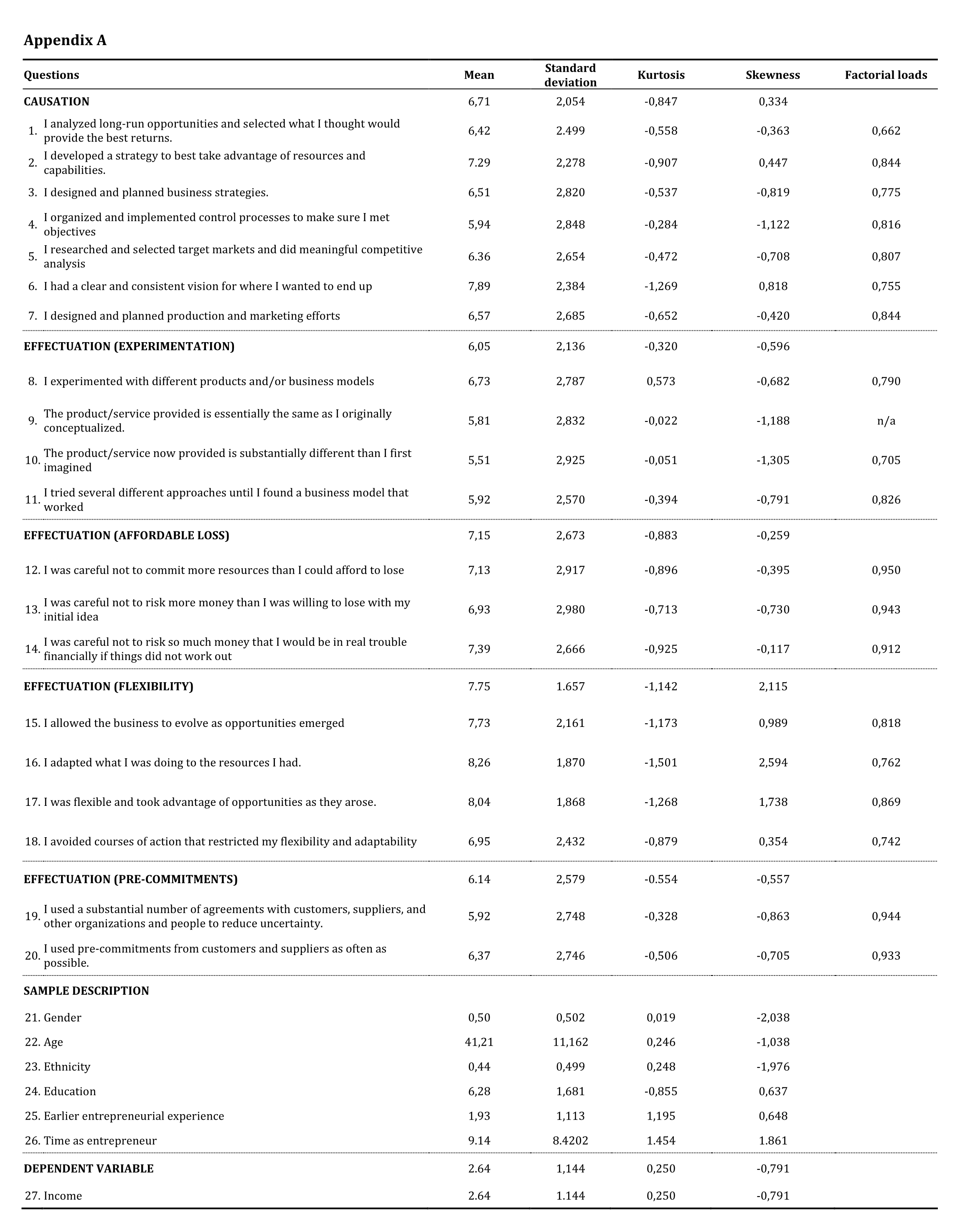 The first 20 questions were grouped into five dimensions, along with their respective factorial loads. The first dimension, with seven items, refers to the causation approach, and the others, to effectuation, with 13 items, divided between experimentation (four), bearable losses (three), flexibility (four), and pre- agreements (two).
