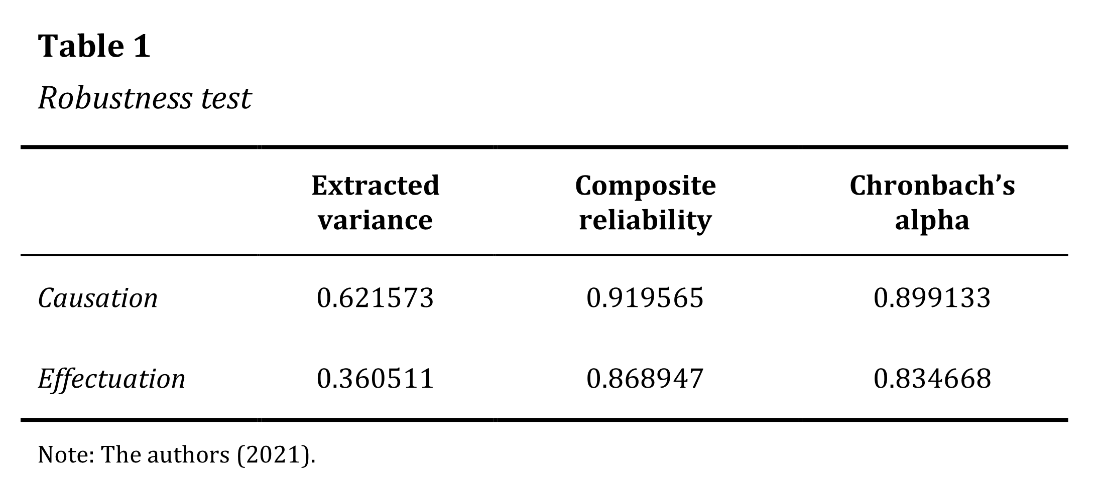 The data allowed to confirm the robustness of the sample and the statistical models. Although the variance extracted from effectuation was below the acceptable limit (0.5) (Hair et al., 2005), the construct was validated, as it is a subjective variable, acceptable for a value above 0.32 (Tabachnick et al., 2001), and also for having obtained adequate indexes for the compound reliability and Cronbach’s alpha (above 0.7) (Hair et al., 2005).