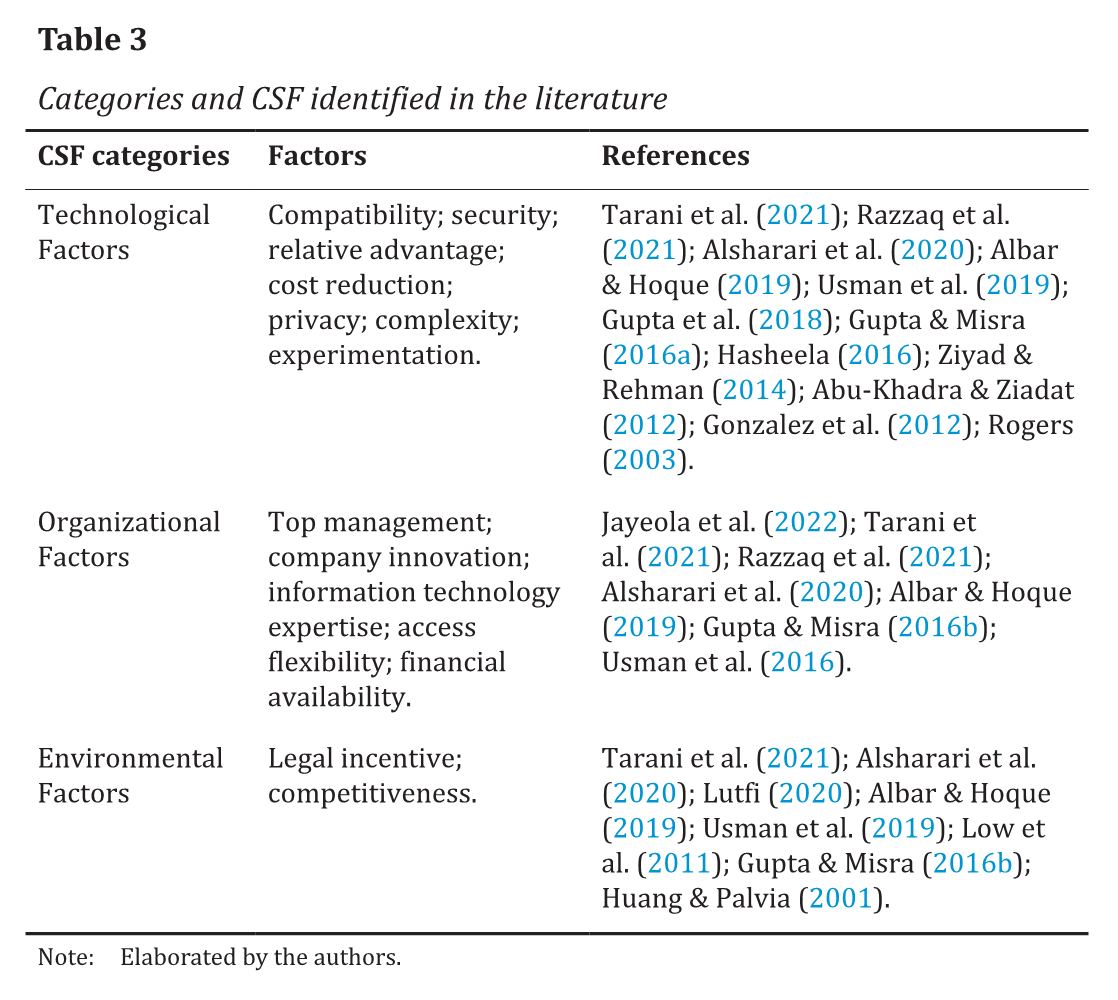 Previous studies in the field (Jayeola et al., 2022) need more precision in addressing and evaluating the CSF related to ERP Cloud implementation. They also reinforce the need for a comprehensive model for SMEs, simultaneously considering the different perspectives on implementing the management system (Tarani et al., 2021). About this gap in the literature, Usman et al. (2019) argue that there is a need for studies that not only analyze the factors that influence the implementation of ERP Cloud in SMEs but also integrate innovation factors and the perspectives of technology, organization, and environment (TOE framework).