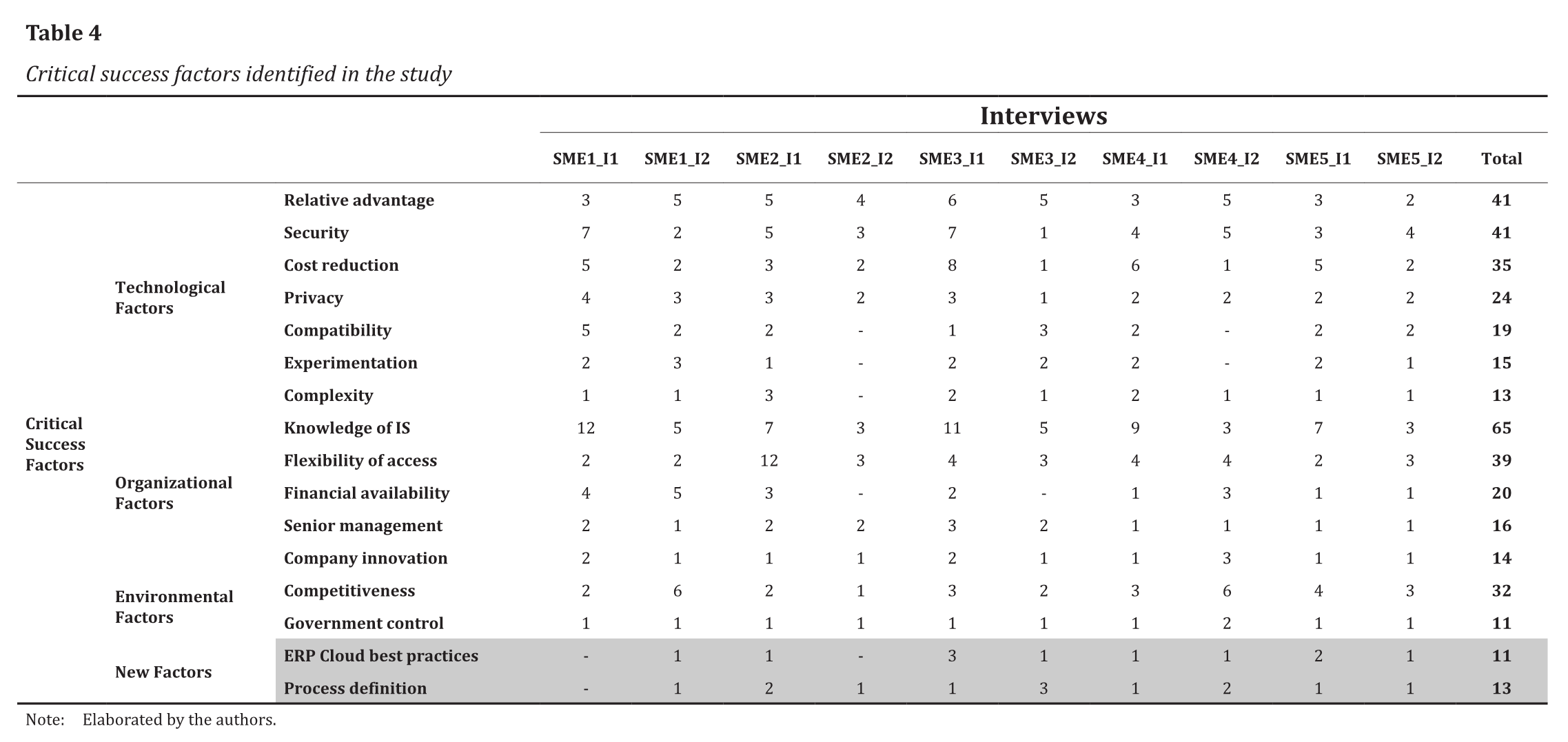 In addition to the organizational, environmental and technological factors mentioned above, the interviews revealed two other factors: good ERP Cloud implementation practices, and help to define organizational processes. Table 4 shows how many times each CSF was mentioned in each interview.