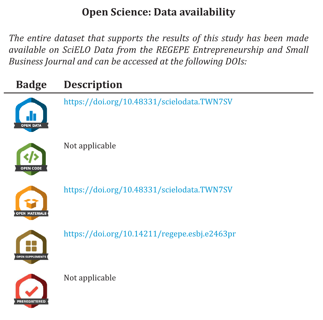 The entire dataset that supports the results of this study has been made available on SciELO Data from the REGEPE Entrepreneurship and Small Business Journal and can be accessed at the following DOIs: