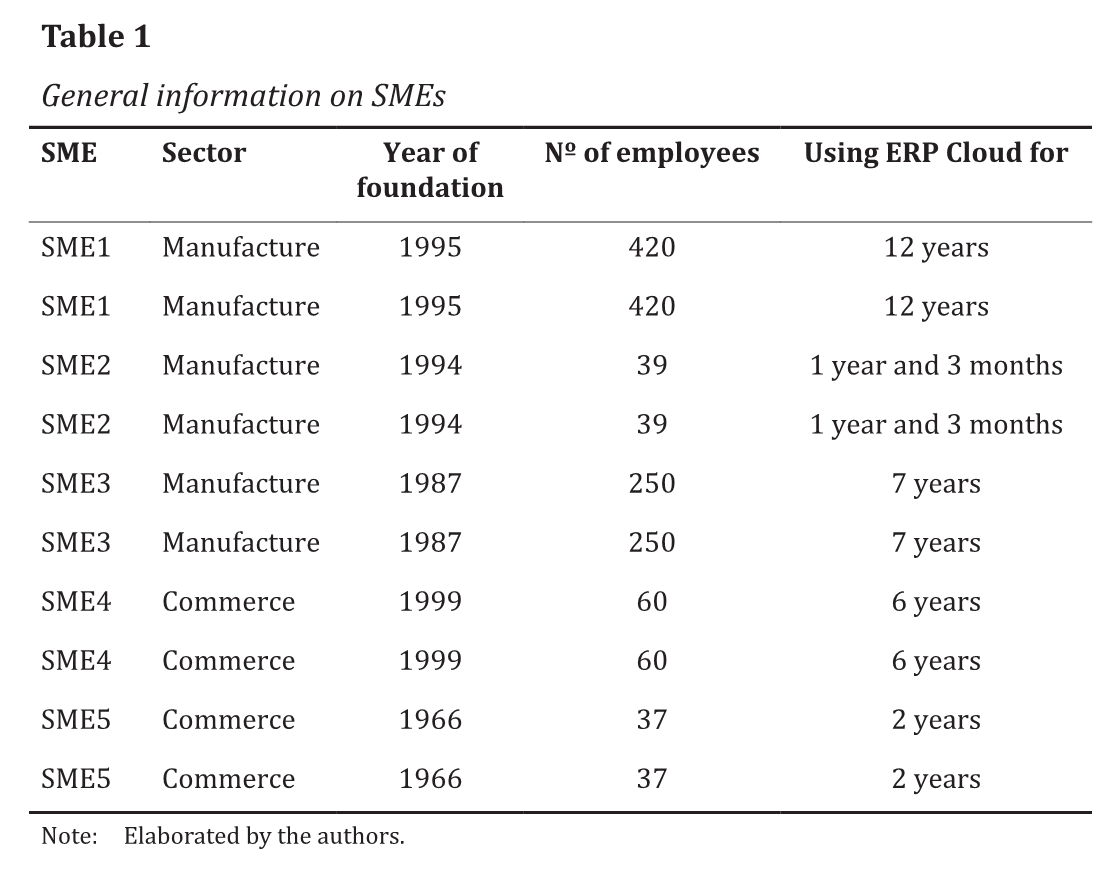 The content of the interviews shows patterns concerning professionals' perceptions of ERP Cloud implementation. O Table 1 presents the data of the SMEs that participated in the analysis, including the sector, year of foundation, number of employees and length of time using ERP Cloud. O Table 2 shows the primary information on the employees interviewed, including job title and level of education.