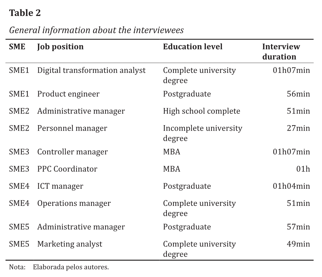 A sample of 5 SMEs was chosen due to the difficulty of accessibility in finding companies willing to participate in the study. In addition, the number of interviews conducted was defined by reaching theoretical saturation in the results obtained from the interviews (Glaser & Strauss, 2017). The interviews were categorized into: SME1_I1, SME1_I2; SME2_I1, SME2_I2; SME3_I1, SME3_I2; SME4_I1, SME4_I2 and SME5_I1, SME5_I2, to represent the company and the interviewee respectively. All the interviews were recorded, totaling 9 hours and 15 minutes of audio, which were transcribed and analyzed.