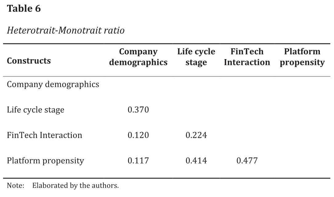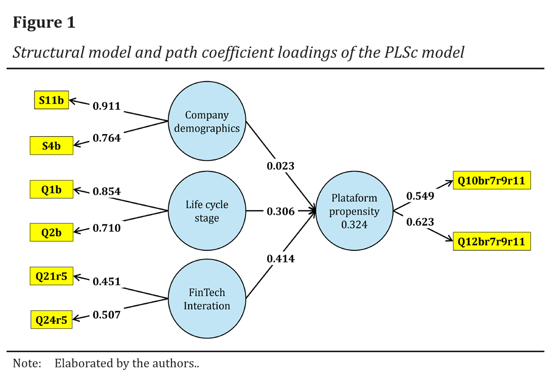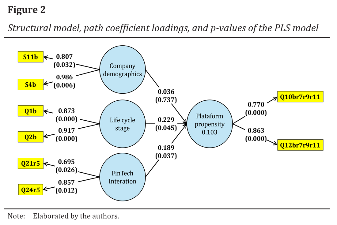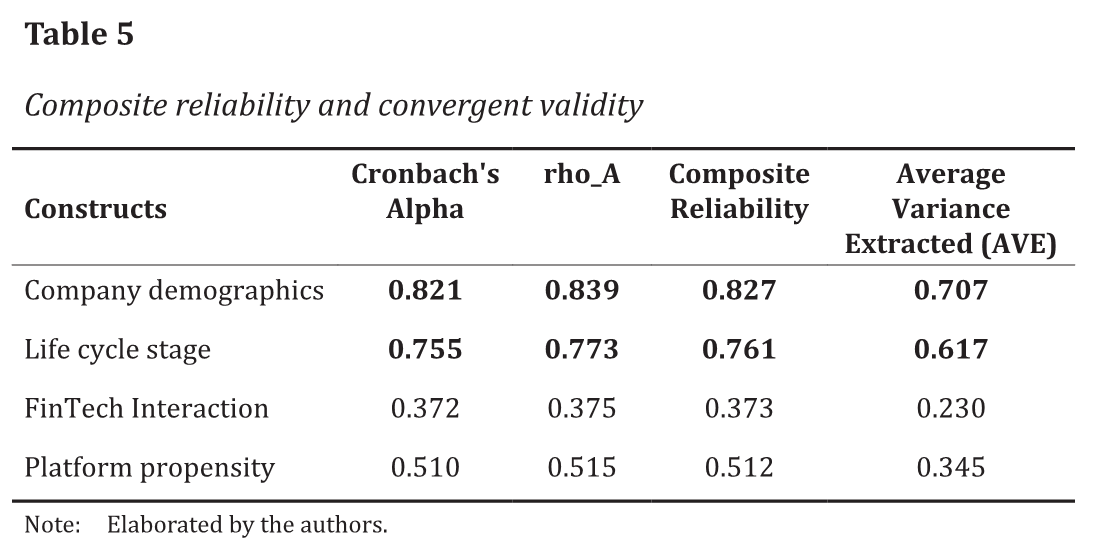 The reliability and validity results are found in Table 5. The model showed satisfactory results according to all indicators for the constructs company demographics and life cycle stage and did not show satisfactory results for the constructs FinTech interaction and platform propensity.