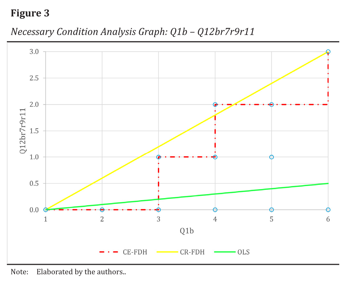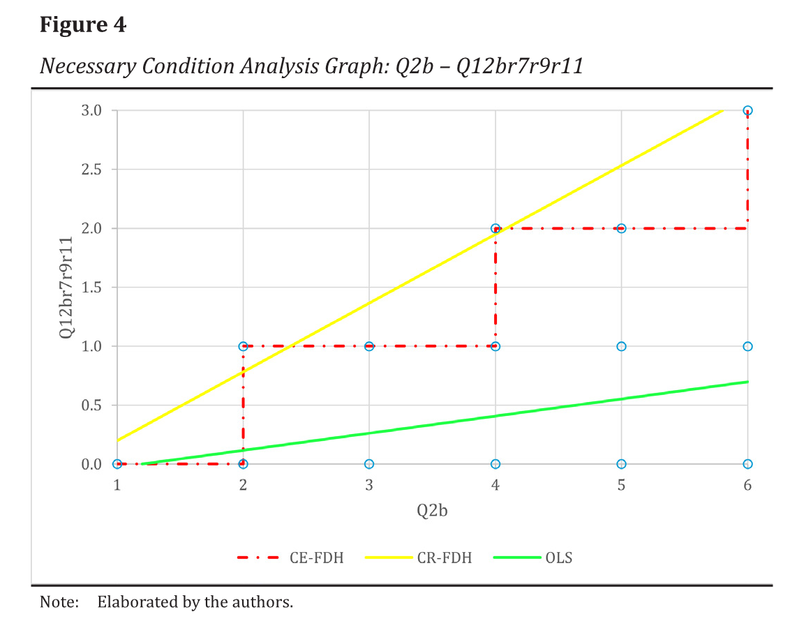 Since the sufficiency analysis did not obtain all the statistically significant results, we complemented the study using the Necessary Condition Analysis (NCA). NCA complements, rather than replaces, traditional approaches to analyzing causal relationships. NCA provides new evidence that is not typically discovered in sufficiency analyses, particularly by the application of PLS-SEM. Before applying the NCA, it is essential that the necessary conditions identified are theoretically justified (Dul, 2016).