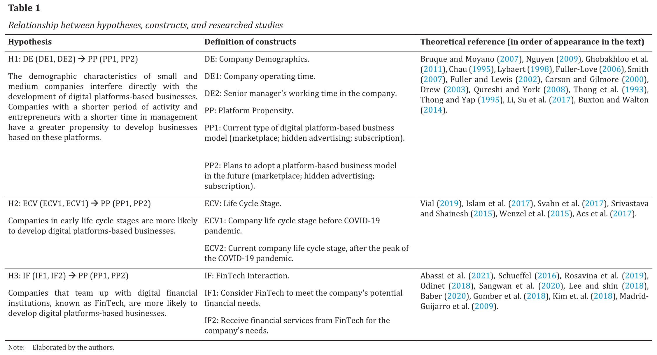 In Table 1 we present the relationship between the hypotheses and the tested constructs.