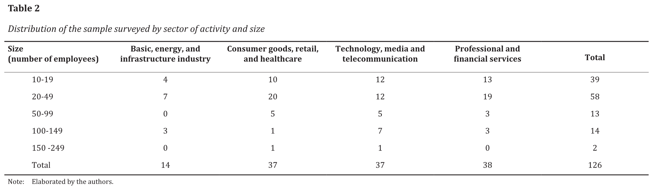We collected data through an online primary survey of 126 companies between March 2 and 15, 2021. The distribution of the sample across the different sectors of the economy and by company size, defined by the number of employees, is in line with expectations. Table 2 presents the distribution of the sample surveyed by sector of activity and size.