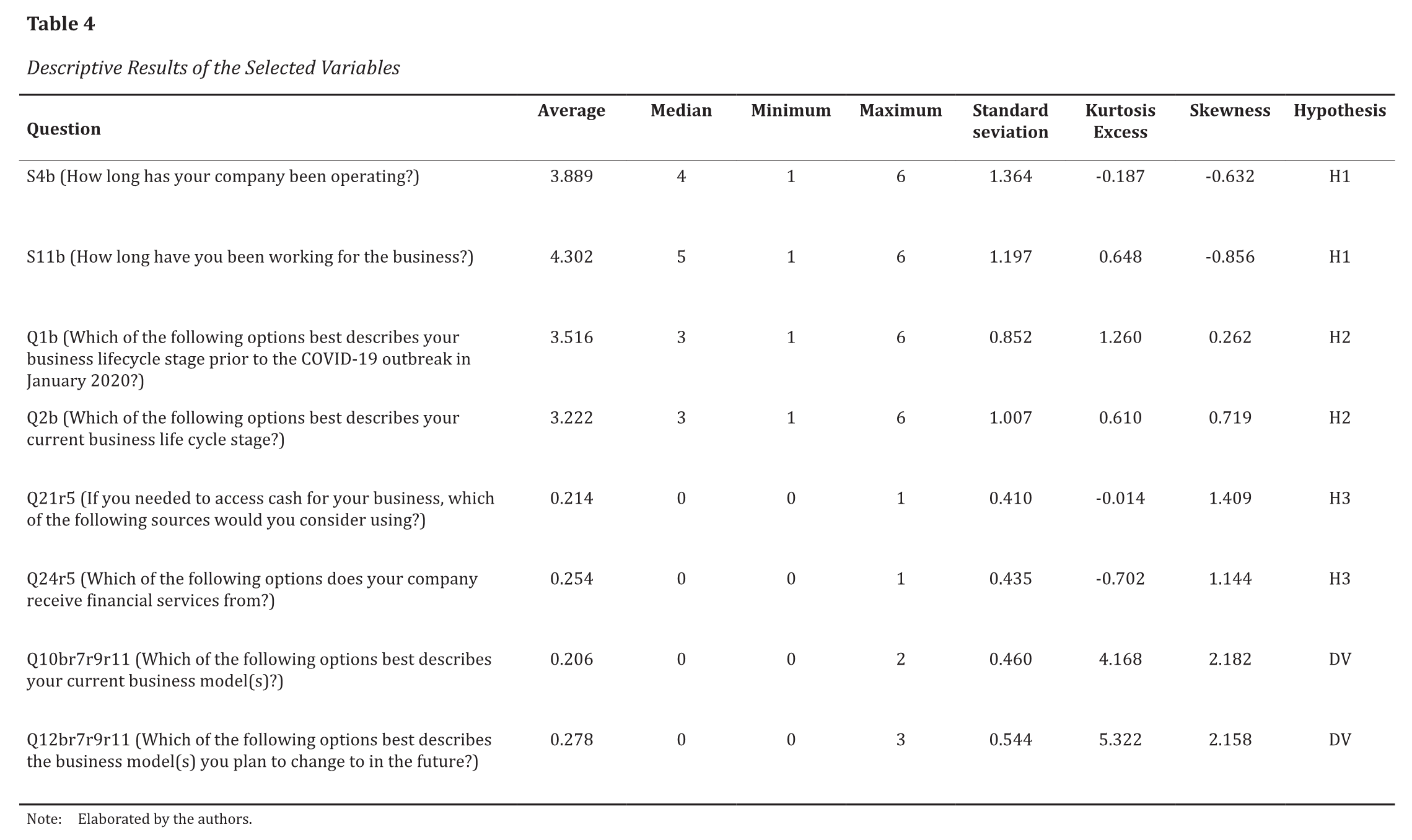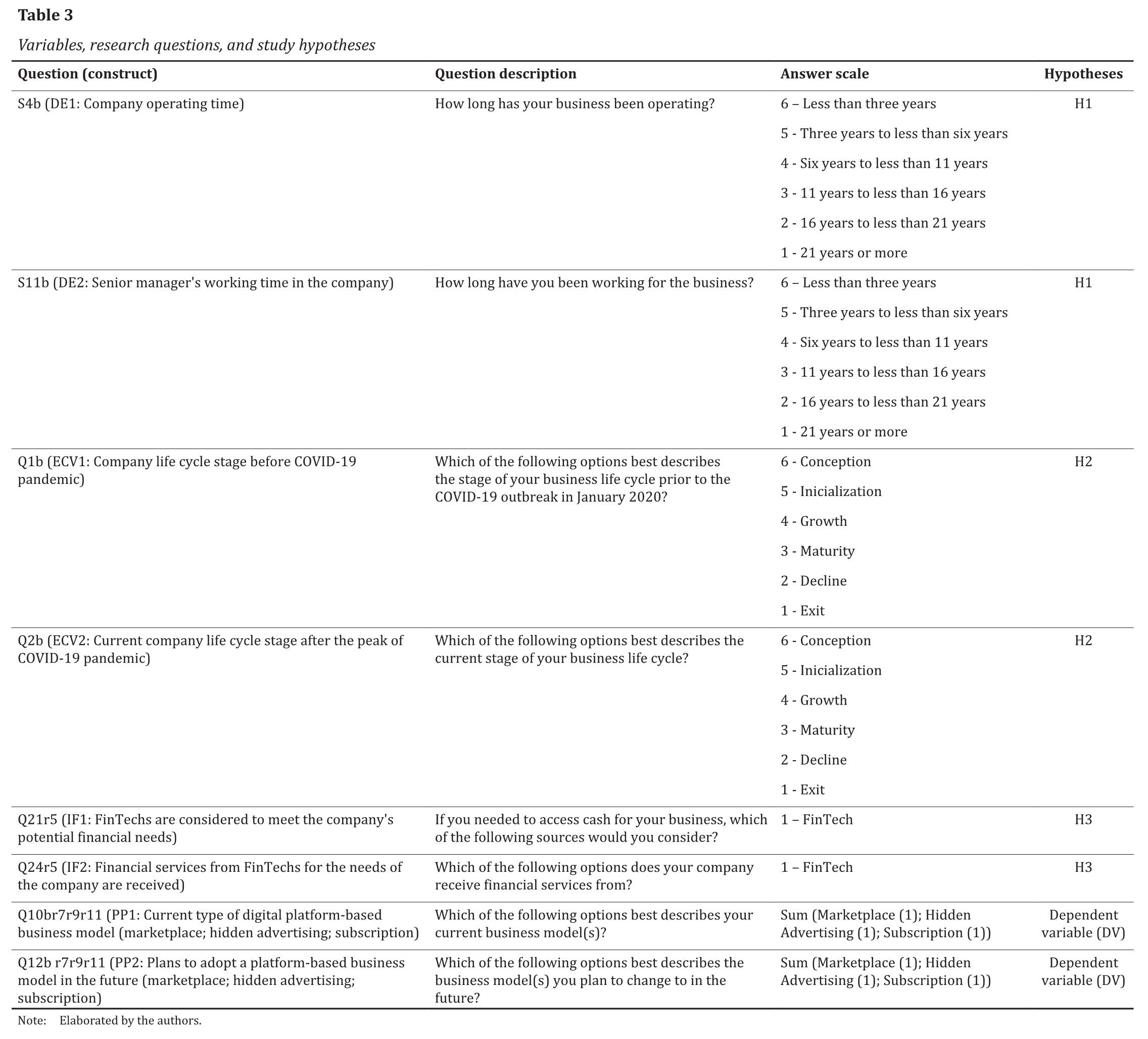 We selected eight research questions that were associated with the dependent and independent variables of the model and that are related to the formulated hypotheses, as presented in Table 3.
