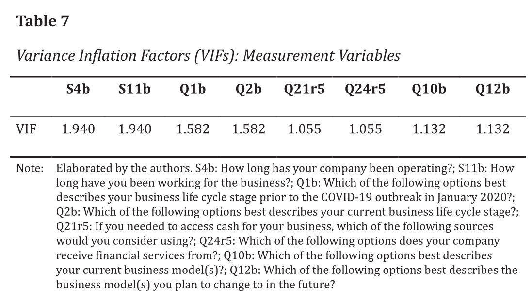 The collinearity analysis, based on the variance inflation factors (VIFs), indicates that the perceived performance measurement variables and the latent variables do not present collinearity issues (VIF < 3). The values calculated for the VIFs for the measurement variables are presented in Table 7.