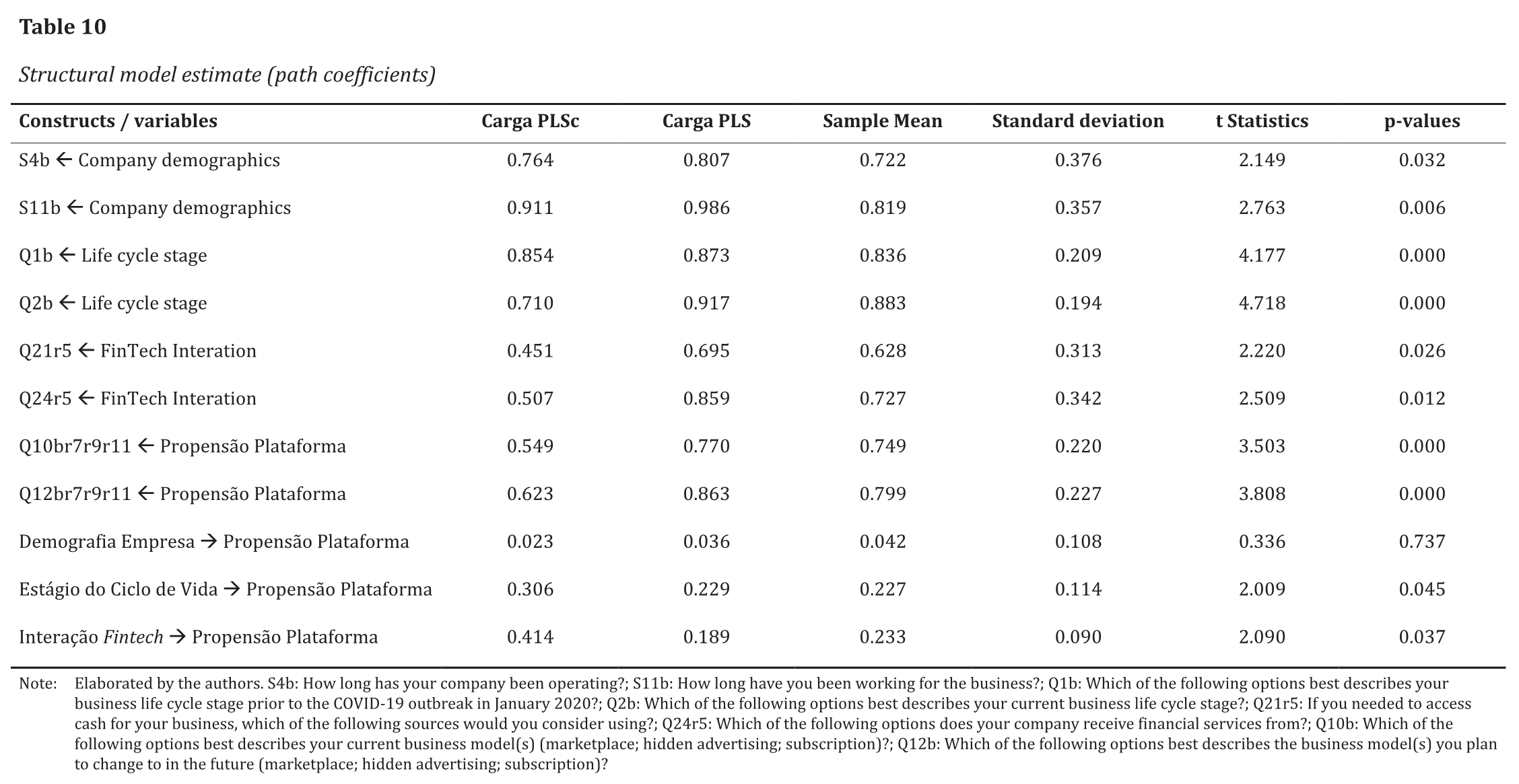 The relationships between the observed variables S4b (How long has your company been operating?) and S11b (How long have you worked for the business?) and the latent variable company demographics present loadings above 0.70 and are statistically significant (p<0.05). The relationships of the observed variables Q1b (Which of the following options best describes the stage of your business life cycle before the COVID-19 outbreak in January 2020?) and Q2b (Which of the following options best describes the stage of your business life cycle currently?) with the latent variable life cycle stage present loadings above 0.70 and are statistically significant. The relationships between the observed variables Q21r5 (If you need to access money for your business, which of the following sources would you consider using?) and Q24r5 (From which of the following options does your company receive financial services?) and the latent variable fintech interaction present loadings below 0.70 in the PLSc model and are not statistically significant. The relationships of the observed variables Q10br7r9r11 (Which of the following options best describes your current business model(s)? Marketplace; hidden advertising; subscription?) and Q12br7r9r11 (Which of the following options best describes the business model(s) to which you plan to change to in the future? Marketplace; hidden advertising; subscription?) and the latent variable platform propensity present loadings below 0.70 in the PLSc model with statistical significance. The results are presented in Table 10 and in Figure 1 (PLSc model) and Figure 2 (PLS model)