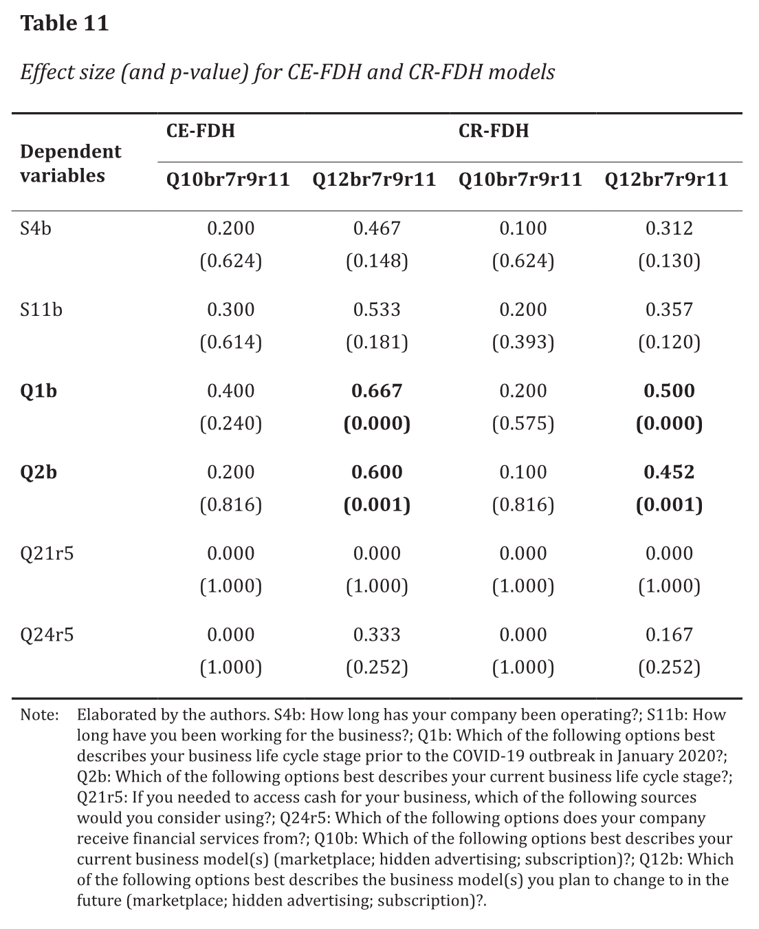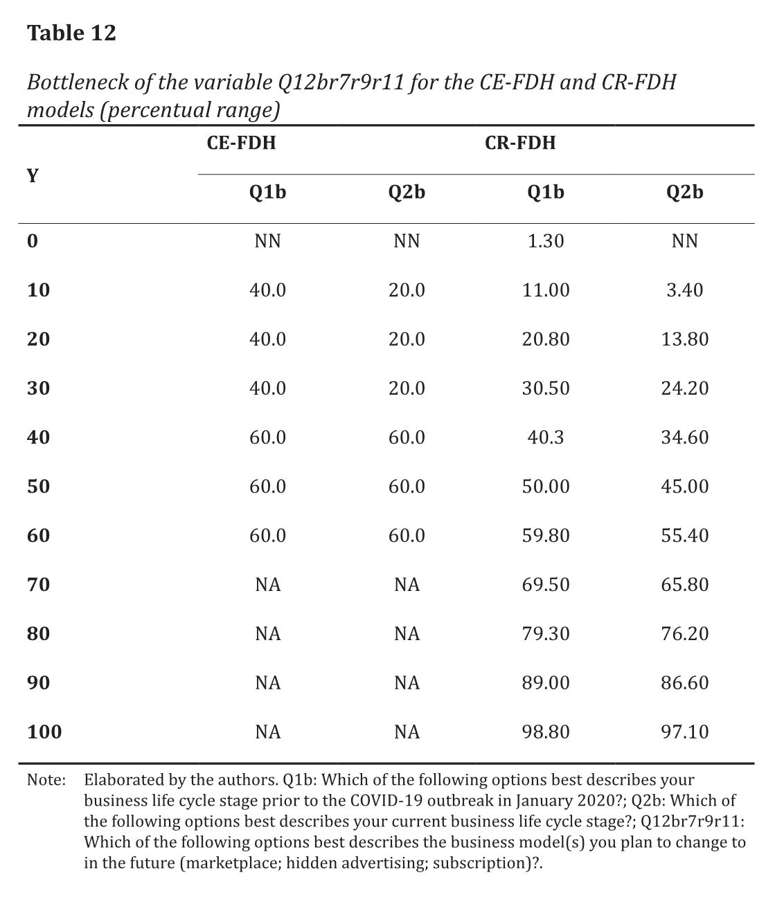 Based on these analysis parameters, we can observe in Table 11 that Q1b (life cycle stage before COVID-19) and Q2b (current life cycle stage) are the only dependent variables for which the necessary condition is confirmed for Q12br7r9r11 (Which of the following options best describes the business model(s) you plan to change to in the future? Marketplace; hidden advertising; subscription?).