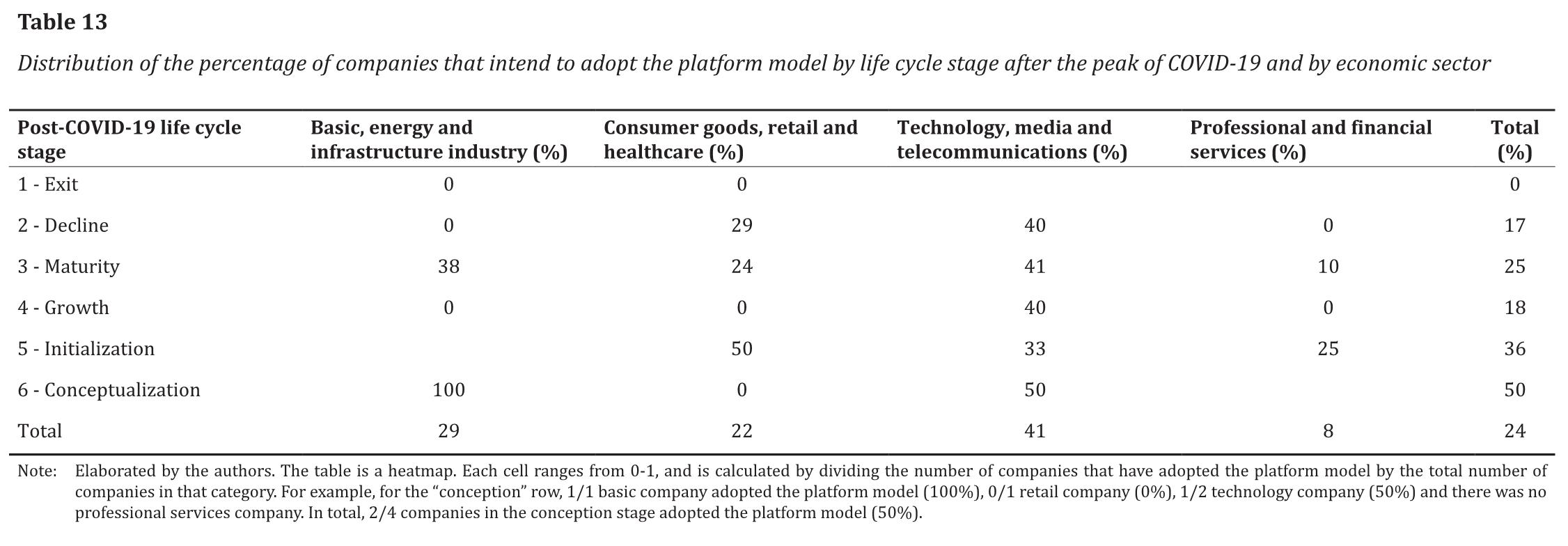 When we look at the distribution of answers regarding plans to adopt a platform-based model in the future at the stage of the company life cycle after the peak of the COVID-19 pandemic, we found that 50% of companies in the conception stage and 36% of companies in the startup stage intend to adopt the platform model. Regarding the economic sector of small companies, 41% of companies in the technology sector, and 29% of companies in the industrial sector intend to adopt the platform model. Table 13 presents the distribution of the percentage of companies that intend to adopt the platform model by life cycle stage after the peak of COVID-19 and by economic sector.