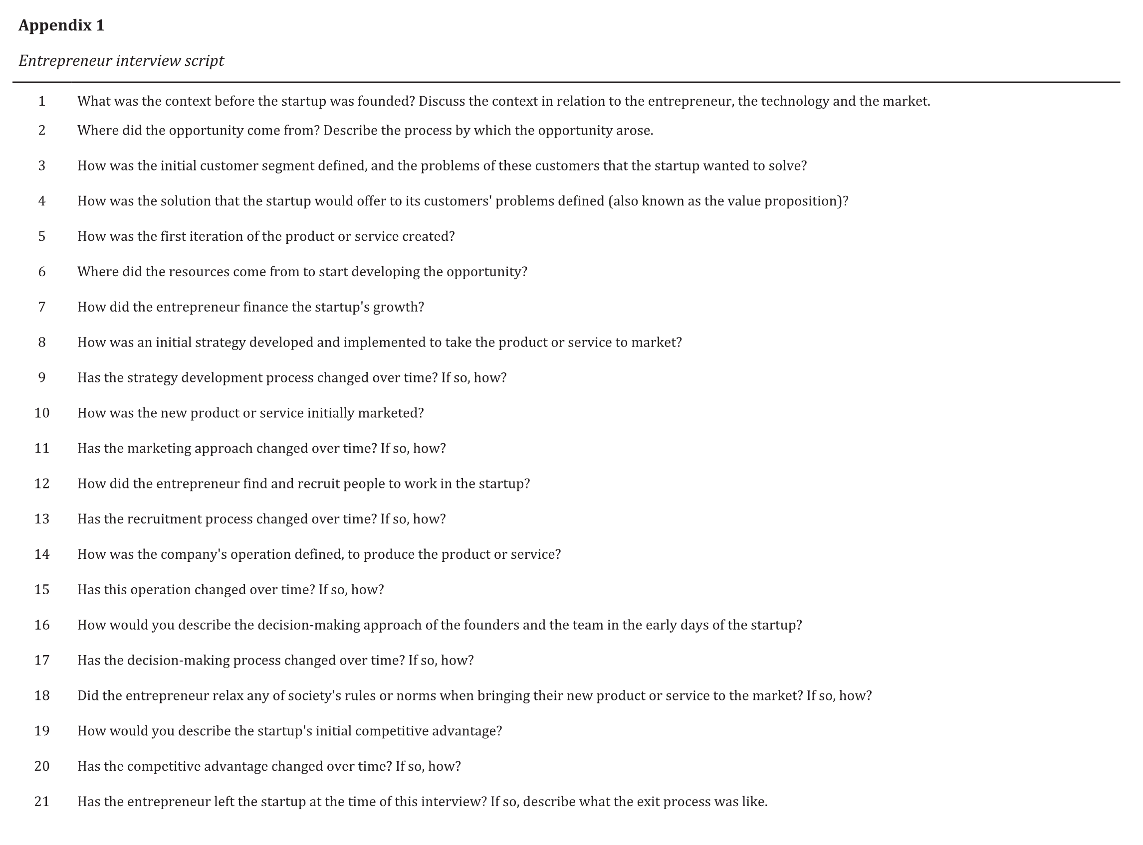 In the interview script we used the established method of Fisher (2012) and Lecuna (2021) to assess the comparative presence of causation, effectuation and bricolage (see Appendix 1). We followed Langley´s (1999) alternative templates approach to create a structured comparison of the incidence of bricolage and effectuation, following Fisher´s specific research strategy – see also Allison (1969, 1971), for the pioneering studies, and similar entrepreneurship studies (e.g. Gancarczyk et al., 2020; Lecuna, 2021; Nelson & Lima, 2020; Ortega et al., 2017). We use Fisher’s analytical platform in our Results section (Tables 1, 2 and 3), with the addition of items 1.1, 2.5 and 2.8 to enhance our case’s analysis, also extracted from Table 2 in Fisher (2012, p. 1030).