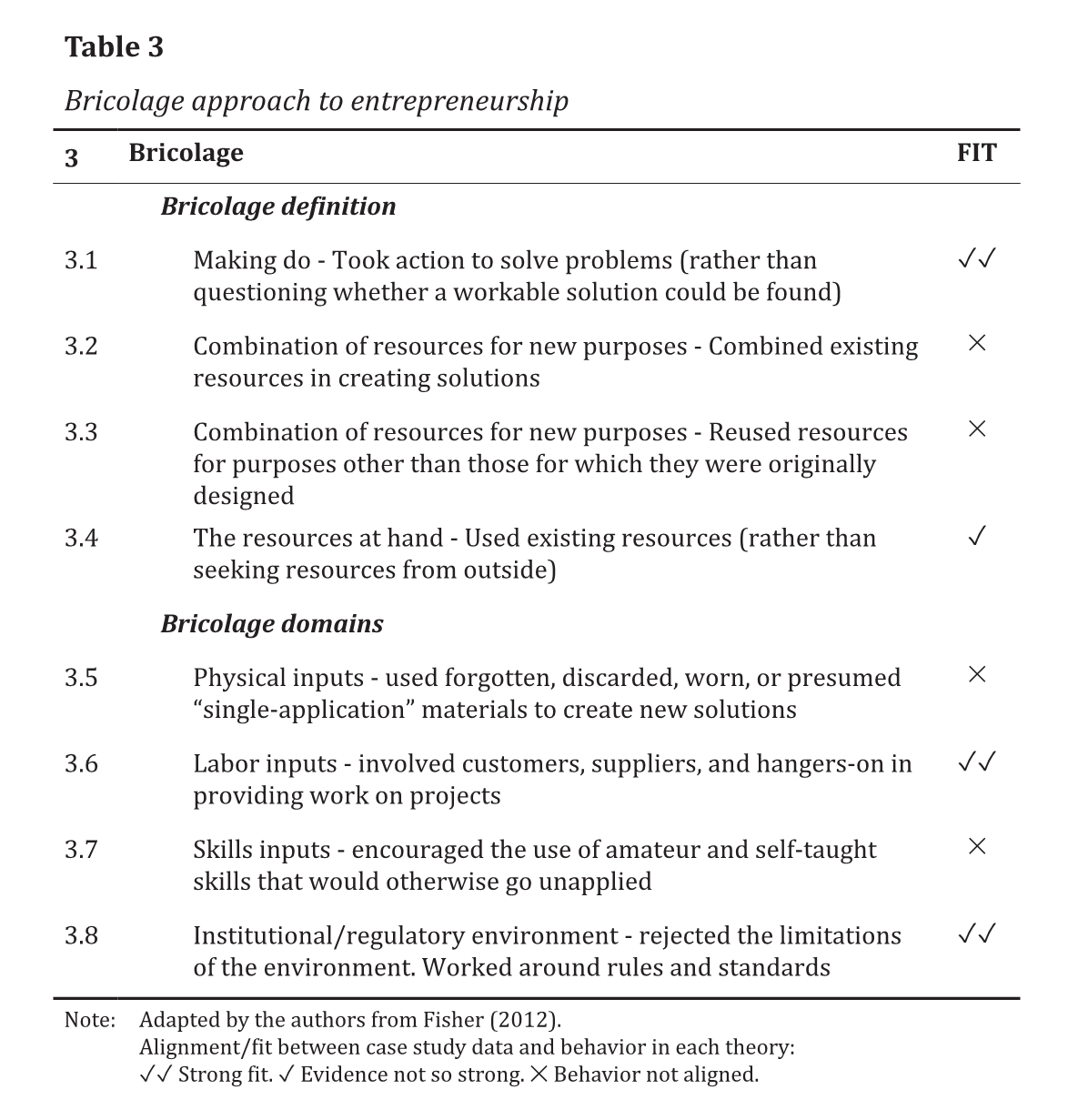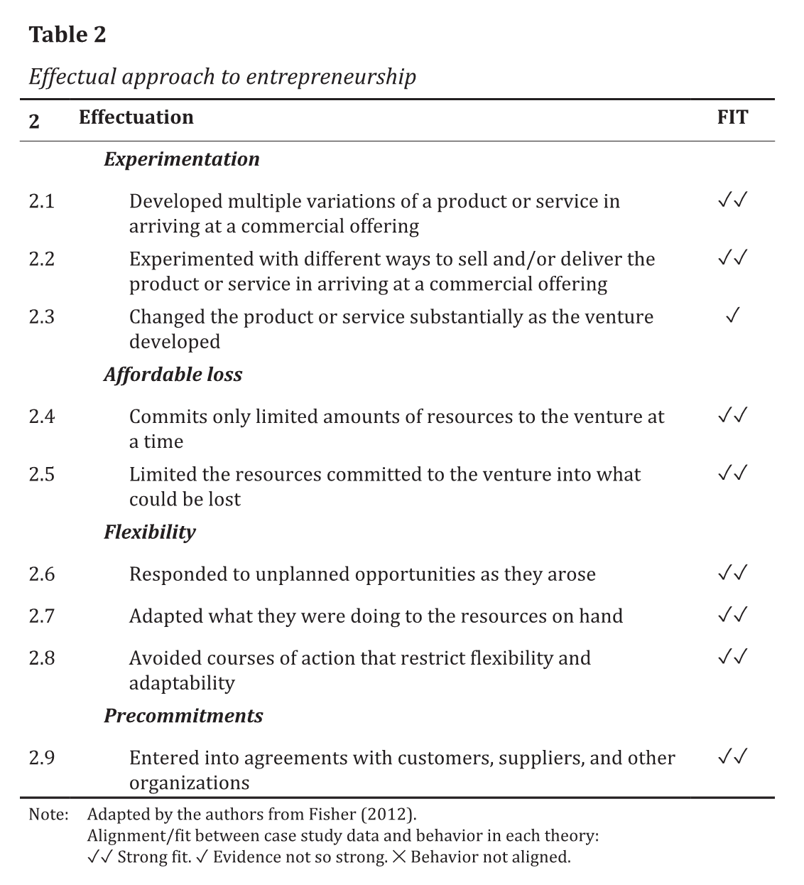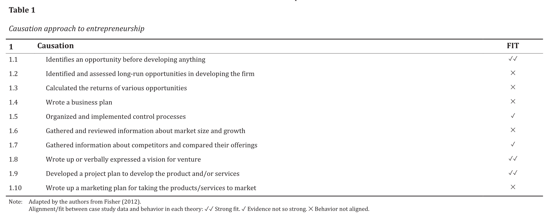 Fisher reviewed entrepreneurship literature to identify the individual observable actions / behaviors that underlie each of these approaches and summarized them in a table (Fisher, 2012, p. 1030). With part of this table, he developed a platform to measure entrepreneurial behaviors related to bricolage, effectuation, and/or causation, which he applied in the analysis of case studies. This platform was further used by other researchers (e.g. Lecuna, 2021; Servantie & Rispal, 2018).