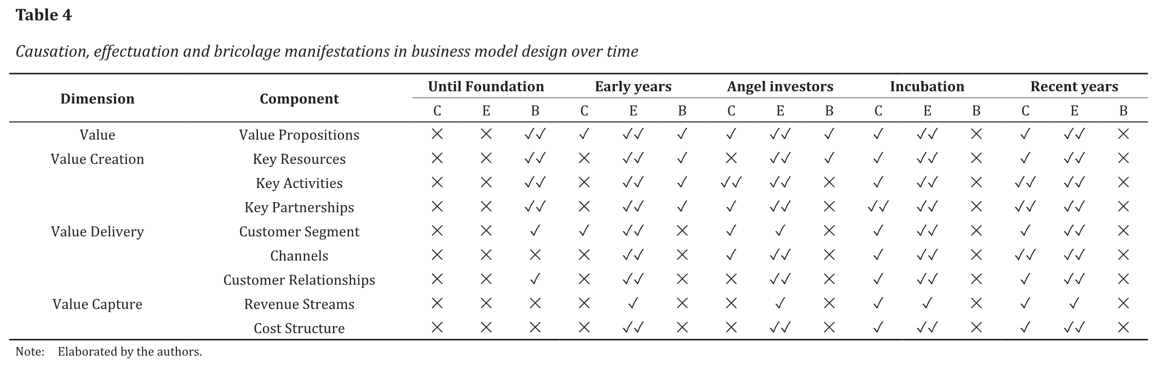 We have established fairly clearly the trajectory of causation, effectuation, and bricolage across the evolution of this startup; however, the greater task remains of teasing out the implications of these results for the business model development process, which emerged from a rather static mindset and would benefit from an understanding of the relationship between alternative rationalities and the components that traditionally compose BMs. This task will require additional research and more space than we have here. However, to start the process we propose the following list of components of the Osterwalder’s model as they relate to the entrepreneurial journey of HS, highlighting the presence of different rationalities across time and components of BM.