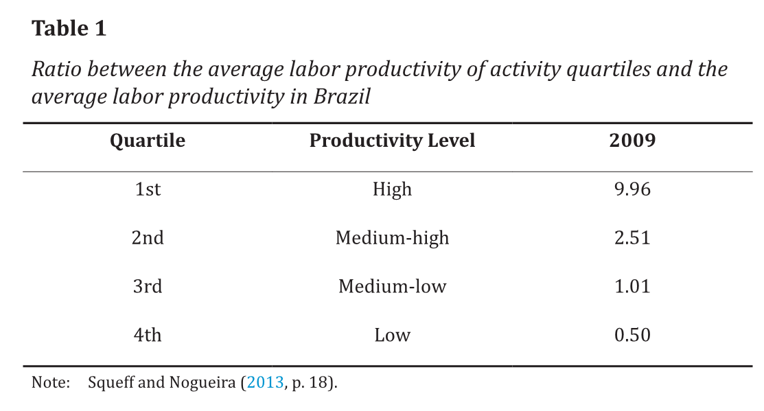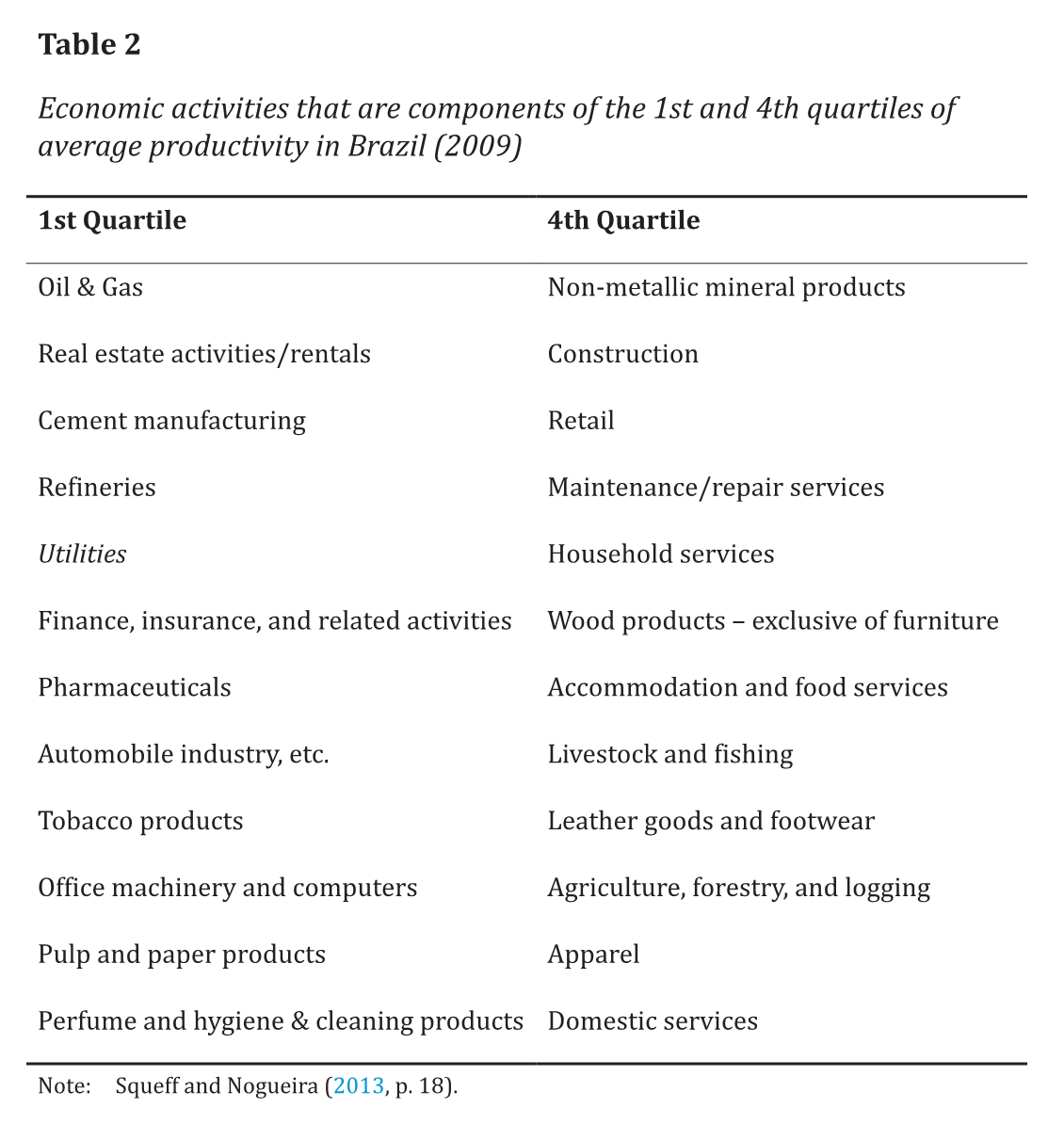 In a text on structural heterogeneity in Brazil, we grouped the 48 business-related economic activities from the National Accounts into quartiles of productivity (Squeff & Nogueira, 2013, p. 18) (Table 1)3.