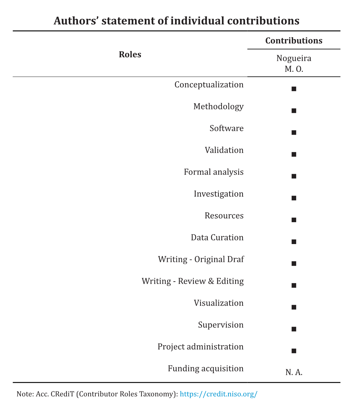 Given the purpose and the synthetic nature of this article, the bibliographic references related to the considerations presented in this text are not listed. These can be found in the original work by Nogueira and Zucoloto (2019). The same applies to examples of the categories mentioned in the text.