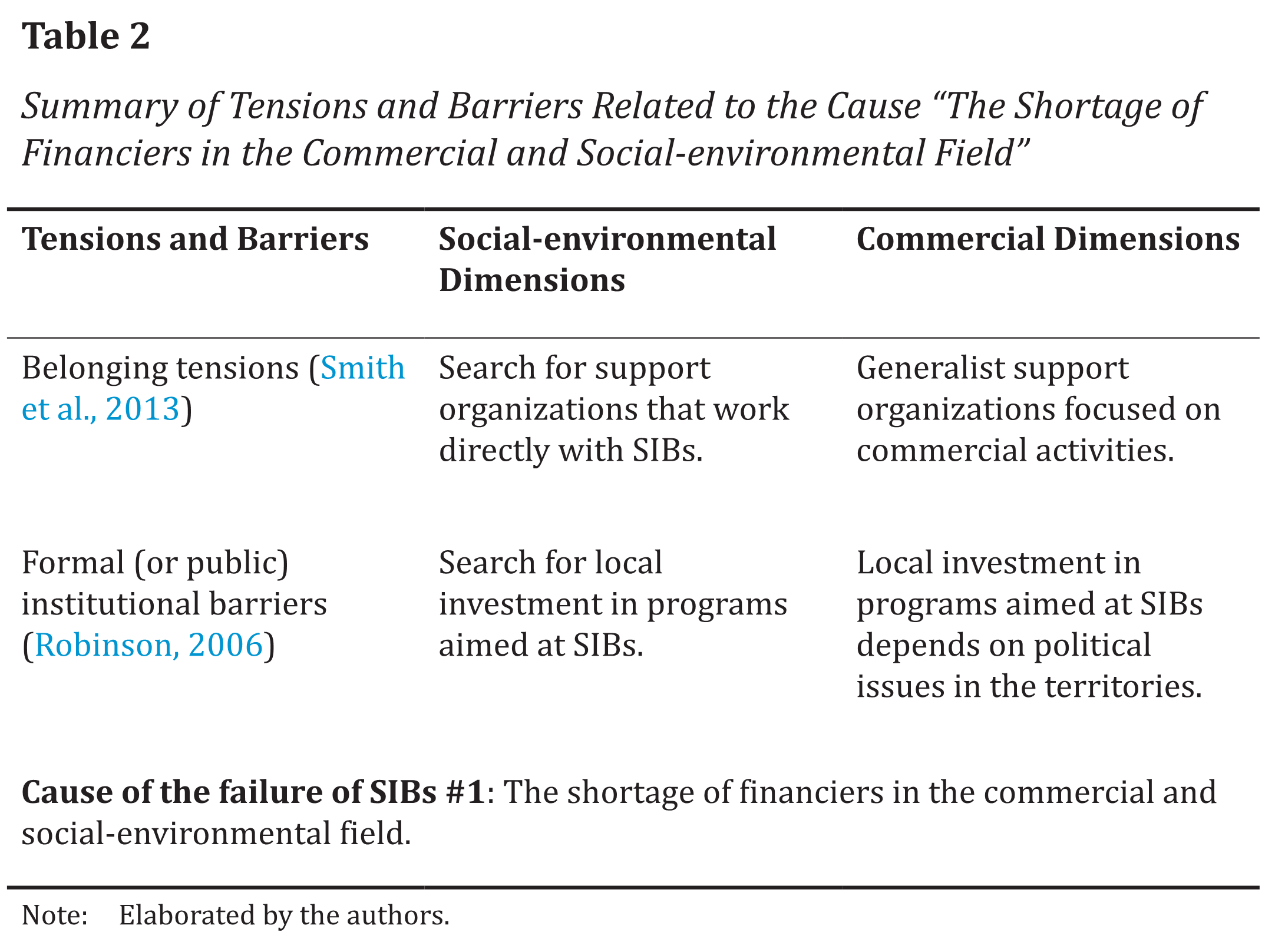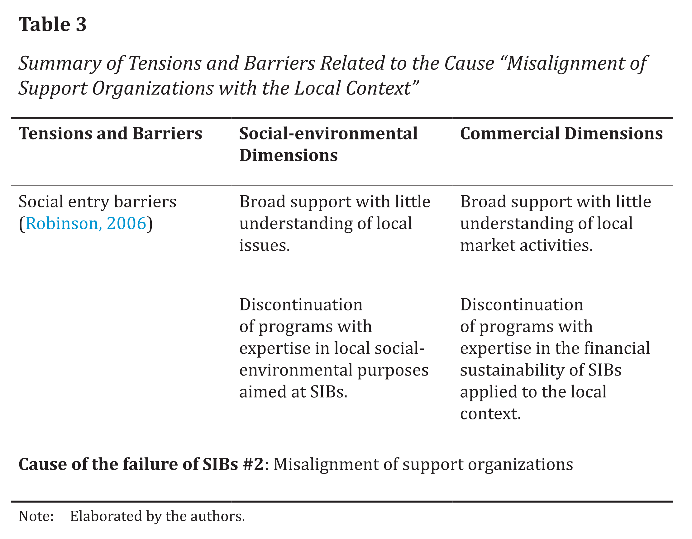 Table 2 shows how the identified dimensions associated with tensions and barriers lead to the interpretation that the cause of SIBs' discontinuation was “the shortage of financiers in the commercial social-environmental field.” In this case, support activities are generally shaped according to the financier’s purposes or interests.