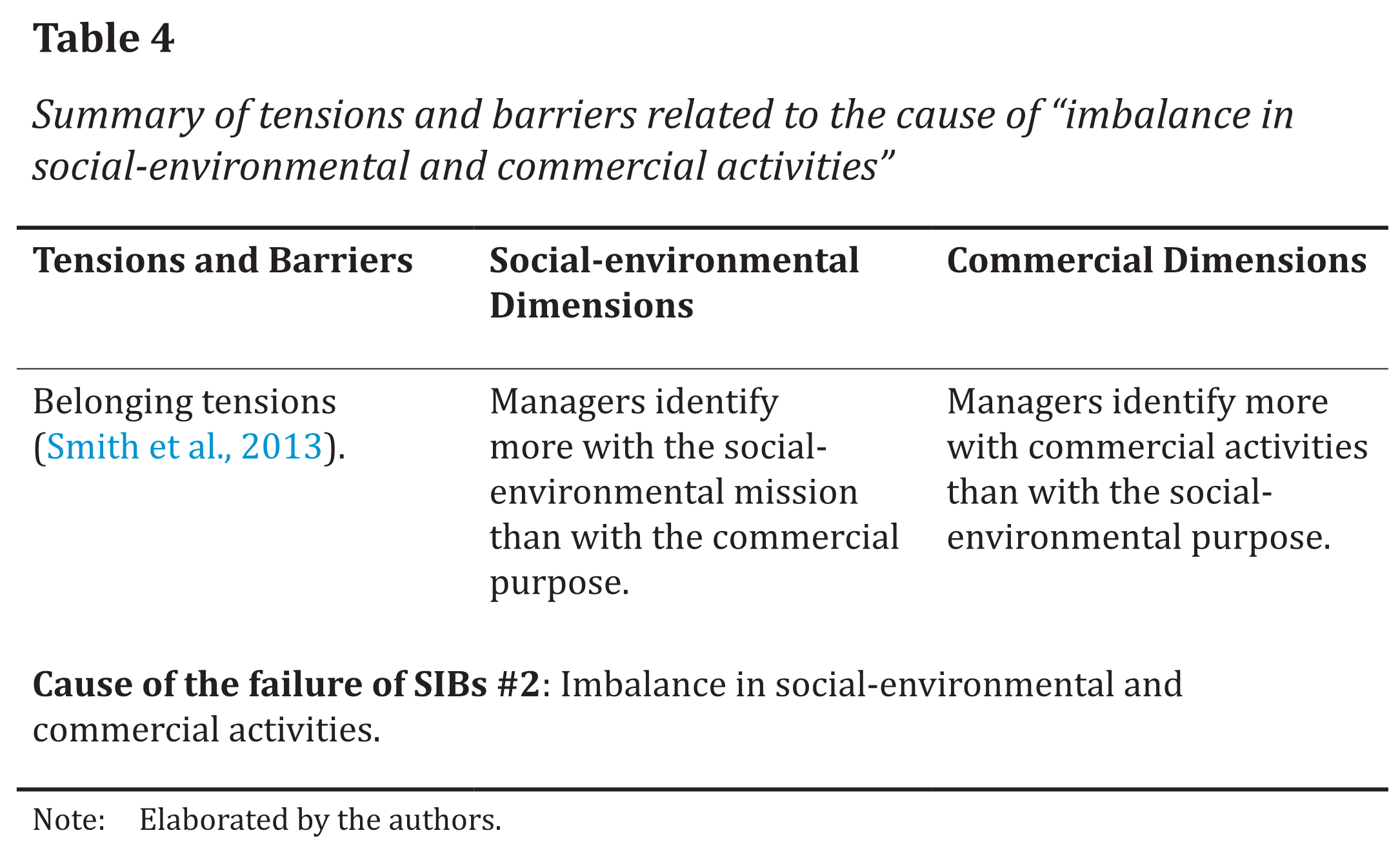 The first reason for the failure is linked to belonging tensions (Smith et al., 2013), identified by the predominant role of supporters in commercial activities and formal (or public) institutional barriers (Robinson, 2006), particularly the lack of local investment.