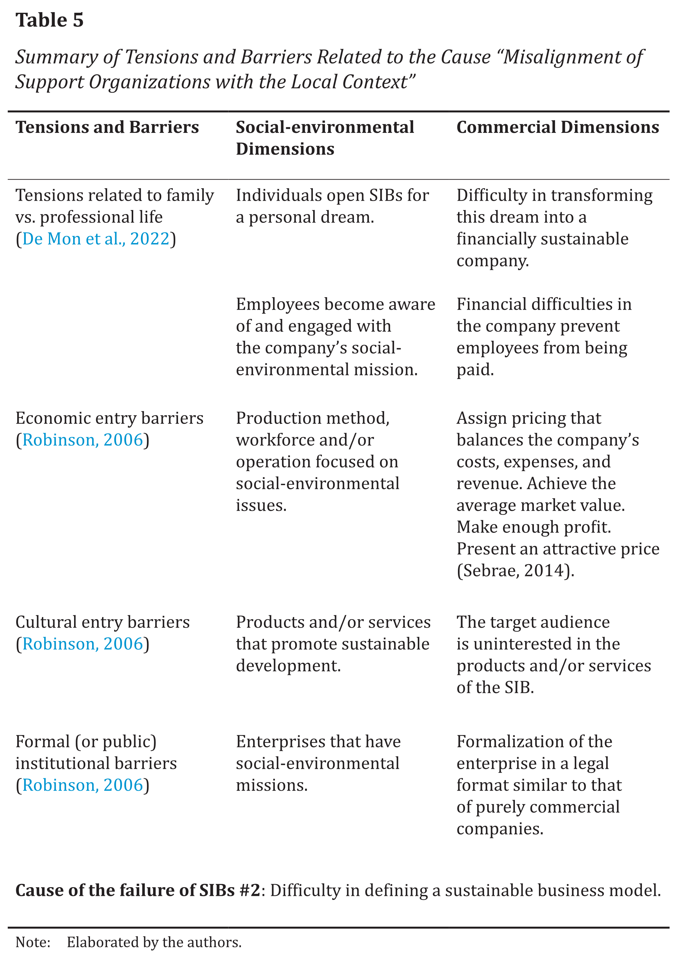 Based on this analysis, this study identifies four key factors leading to the failure of SIBs in Florianópolis: the shortage of financiers in the social, environmental, and commercial fields; misalignment of support organizations; imbalance between social, environmental, and commercial activities; and difficulty in defining a sustainable business model.