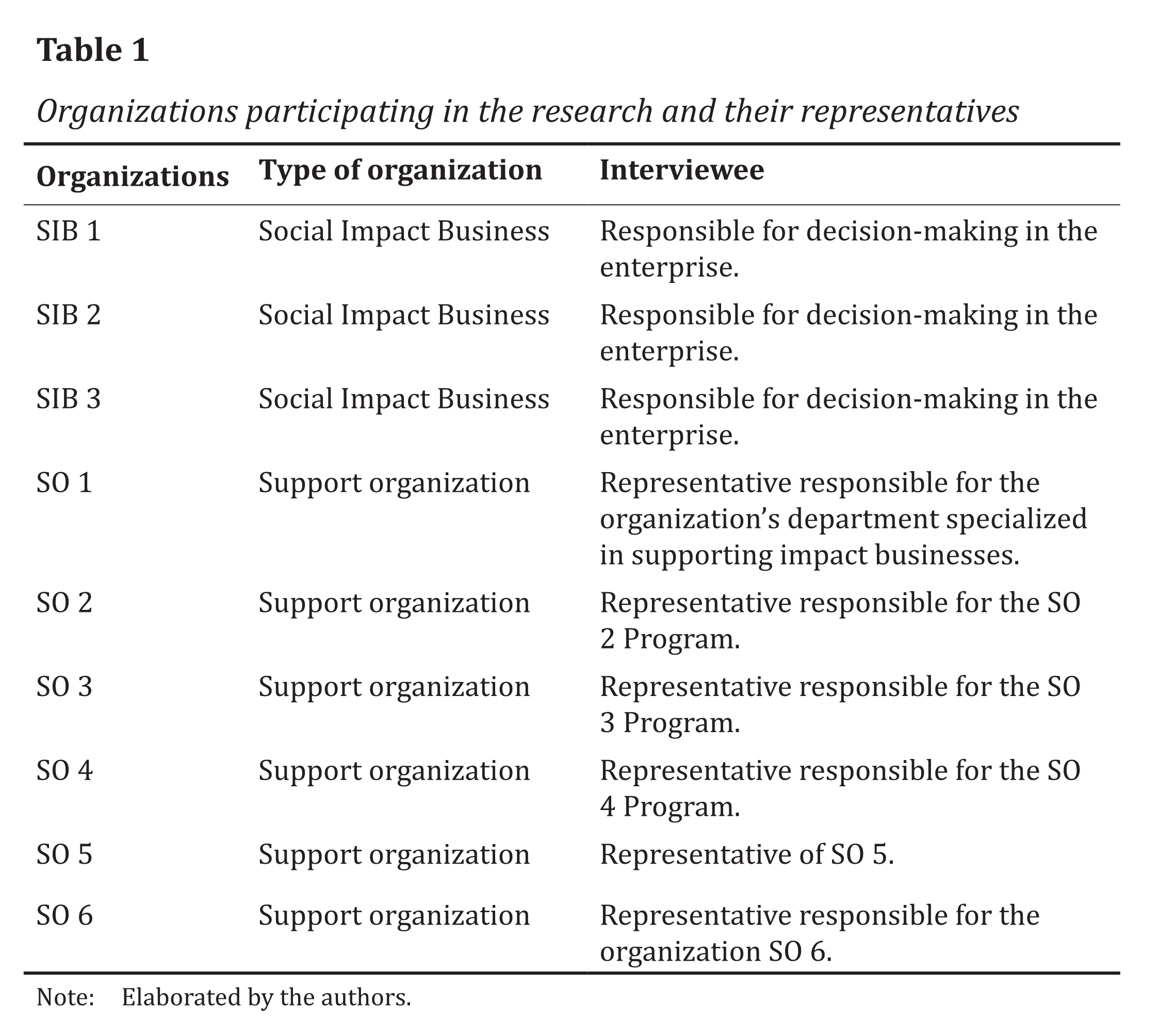 The dimensions elucidated in the subsequent section of this article emerged from the triangulation of data from interviews with key stakeholders, which are instrumental in contextual analysis and documentary research. The interview script involved information identifying the enterprise, including type, leading promoters of the initiative, target social-environmental problem, target audience, main problems faced, actors who provided support (partners, financiers, among others), as well as reasons for the death of the enterprise. Documentary research involved mining content from social media platforms and news sites. Interviews were conducted with managers, investors, and representatives from supporting organizations. Table 1 provides a comprehensive overview of the organizations involved in the research.