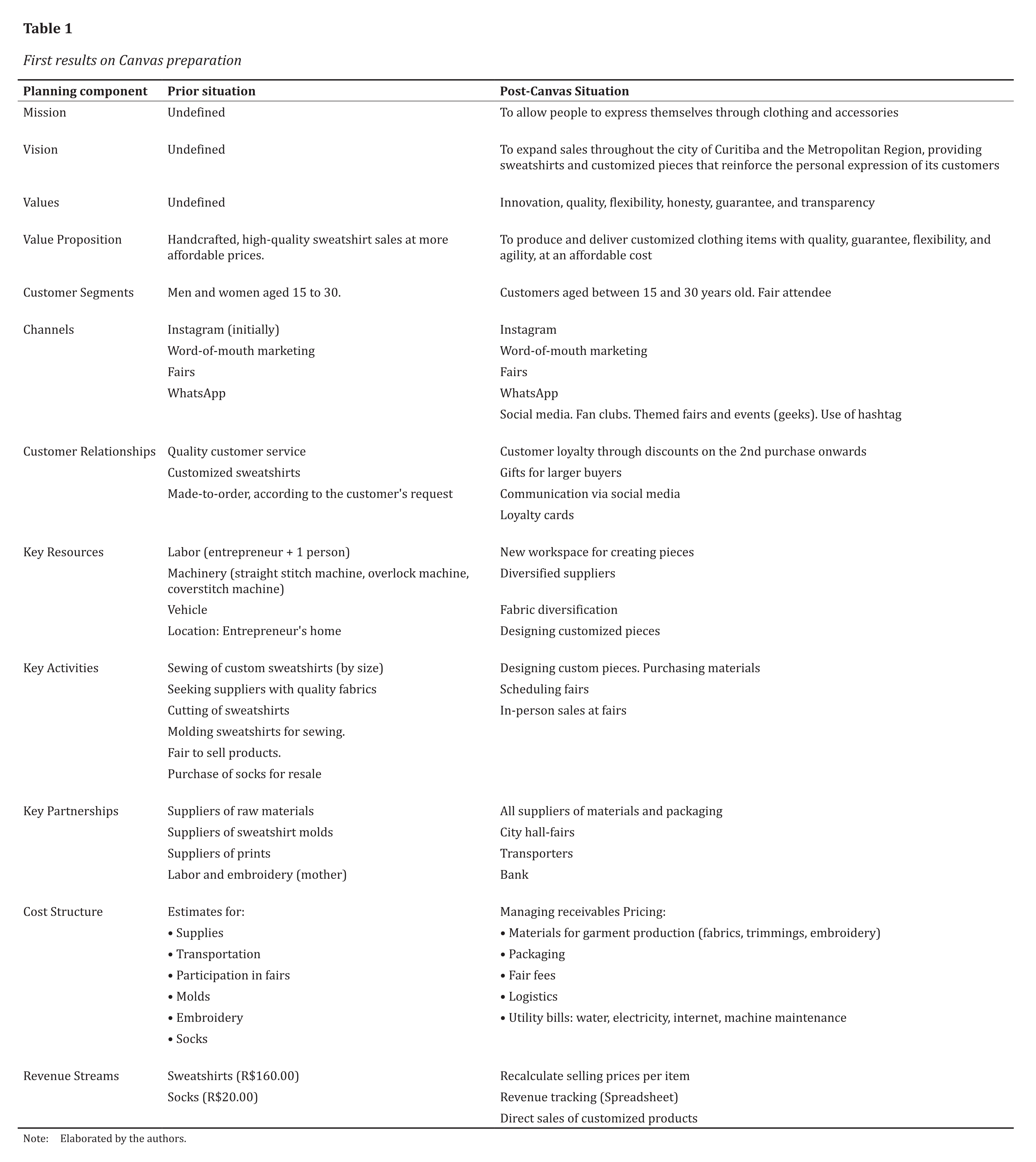 When it comes to key adjustments, the following points where observed: i) clarification of value proposition, shifted from generic product sales to purposefully crafted themed collections targeting niche markets; ii) market segmentation strategy with the identification of two core customer segments, which are the general fair visitors and niche communities (e.g., geek fashion enthusiasts); iii) brand positioning to enhance digital marketing efforts through targeted social media campaigns, thereby increasing brand visibility; iv) financial restructuring with the implementation of a cost-tracking system to optimize pricing strategies, which improved overall financial health (Padoveze, 2015).